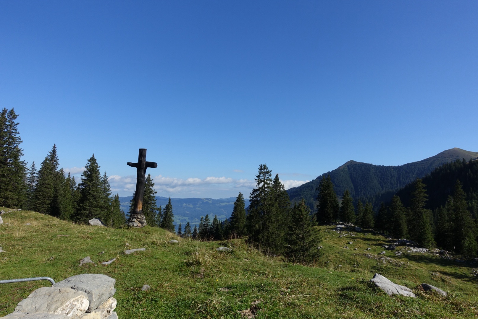 Aussicht beim Mittelpunkt der Schweiz auf der Älggialp mit Holzkreuz und Bergpanorama