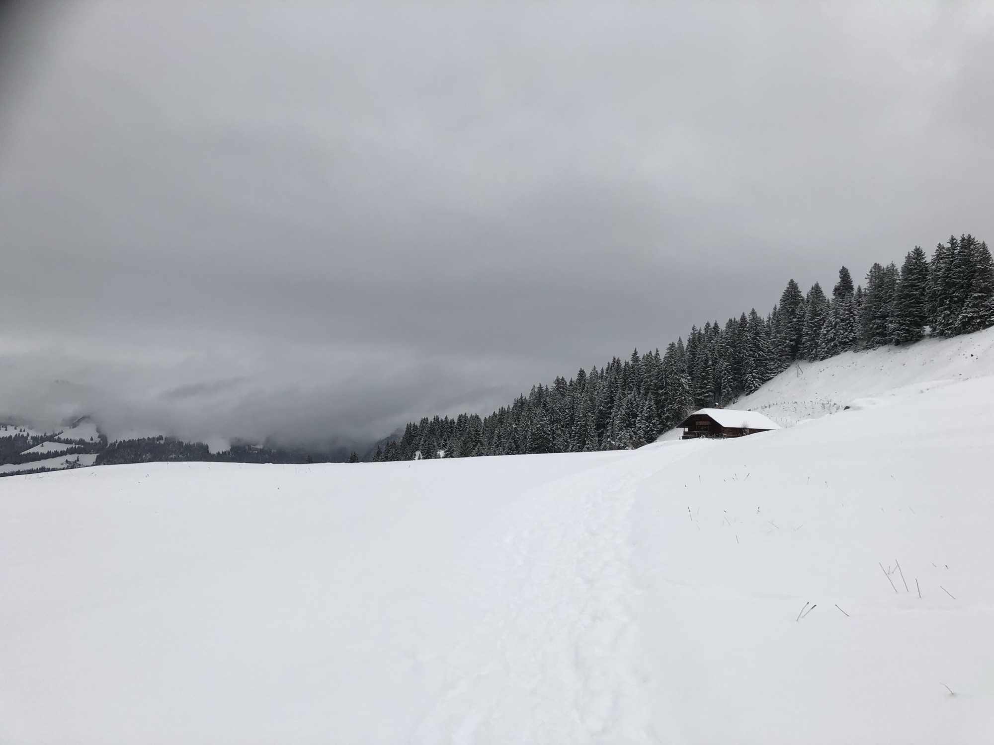 Winterlandschaft auf dem Springenboden mit sanften Hügeln, Tannenwald und alpiner Weite