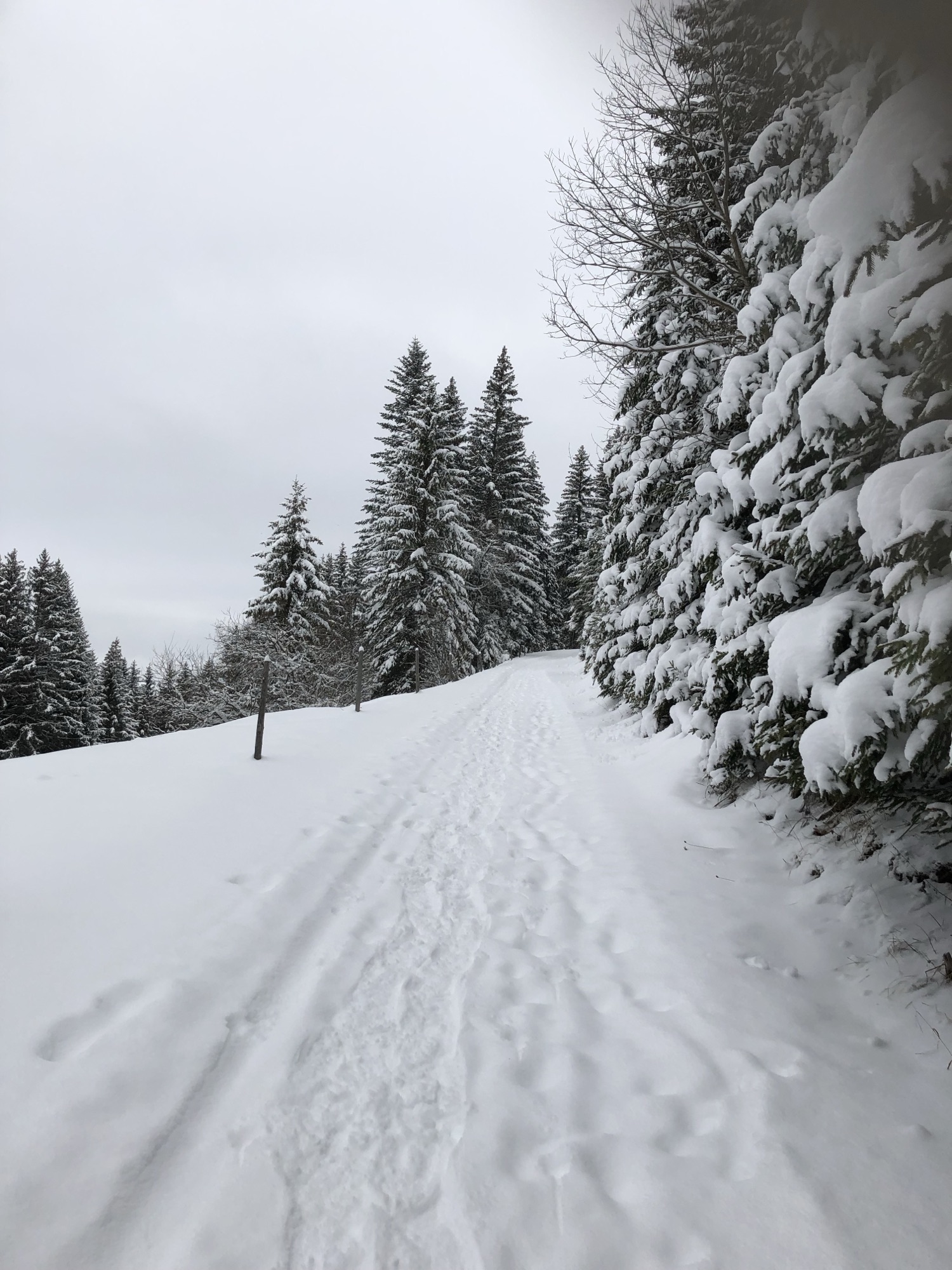 Panoramablick vom Springenboden ins hintere Diemtigtal mit verschneiten Bergen und Tannen