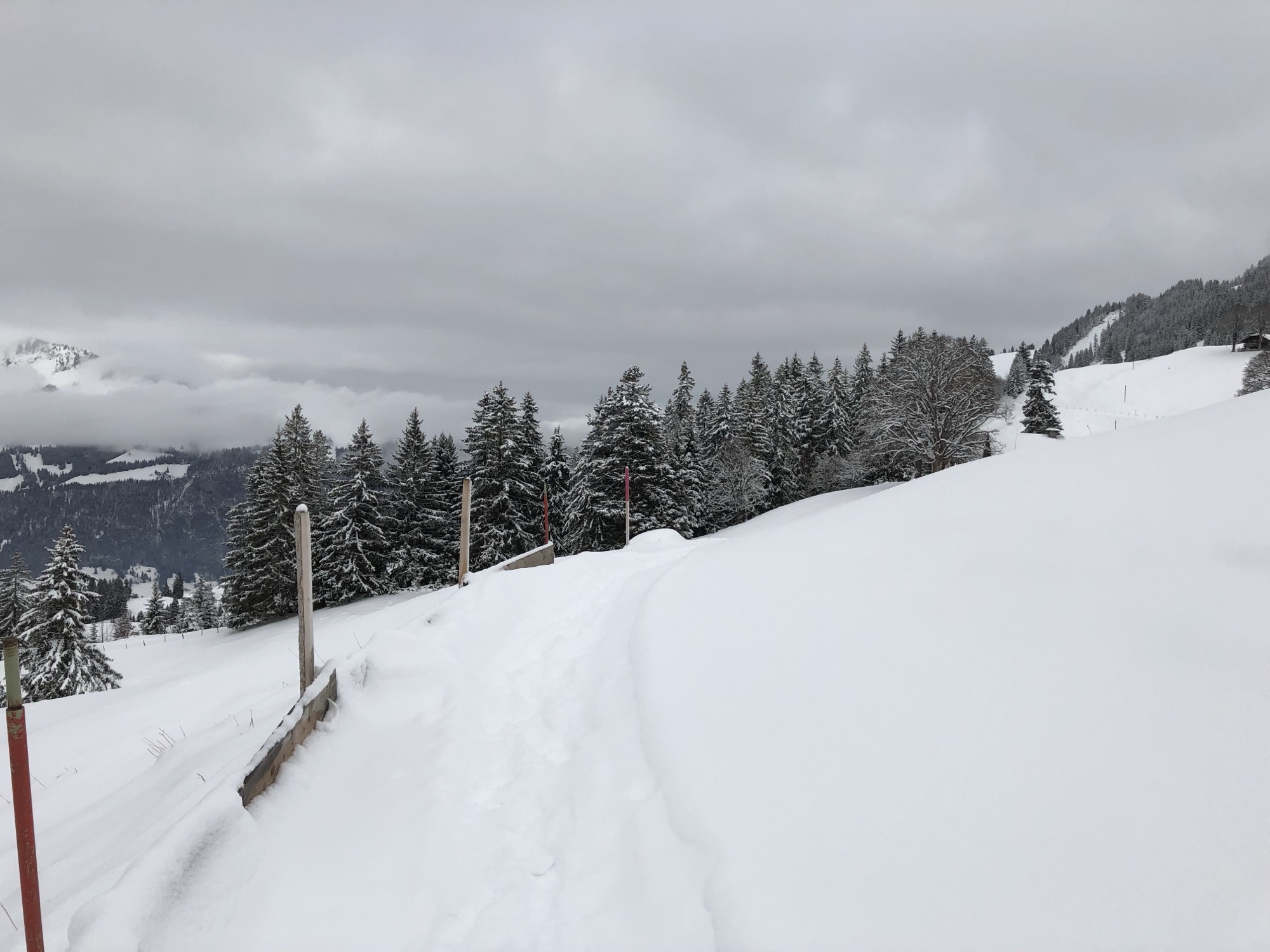 Präparierter Winterwanderweg auf dem Springenboden mit Schneestangen und frischer Spur