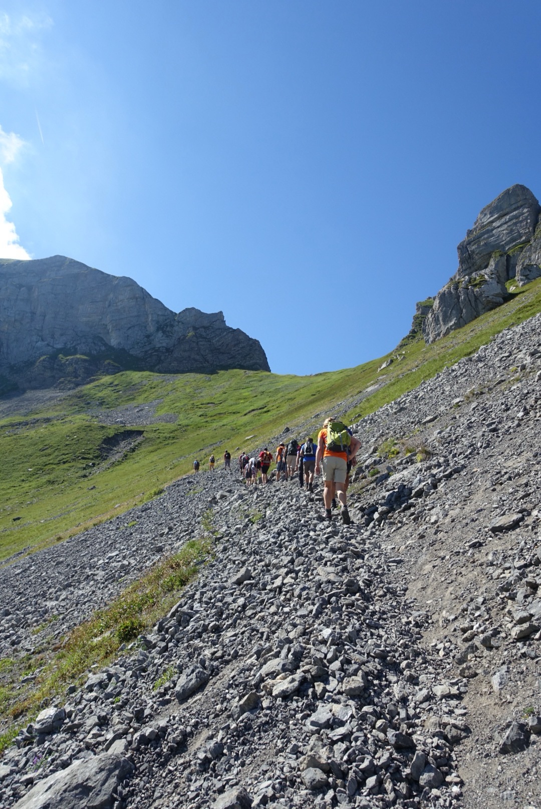 Wandergruppe auf steilem Geröllweg Richtung Abgschütz oberhalb der Älggialp