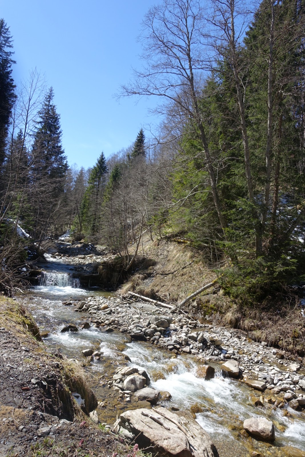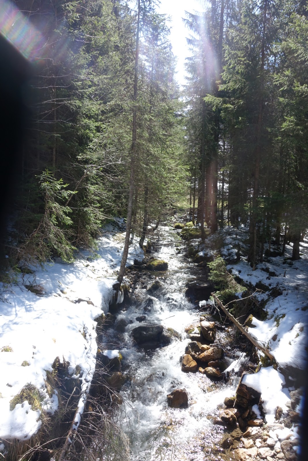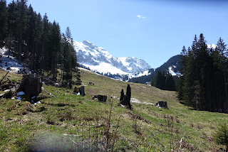 In Adelboden angekommen erwartet uns Sonnenschein und blauer Himmel. Wenn Engel reisen, lacht der Himmel. Entlang eines Baches laufen wir in Richtung Berglägger. Shila geniesst den letzten Schnee und kann auch ab und zu ein Bad im Bach nehmen. In meiner Kindheit haben wir öfters Urlaub in Adelboden gemacht. Auch die Lenk kenne ich gut. Die Strecke ist ein Teil der Via Alpina.