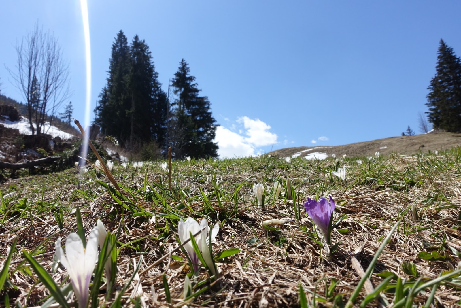 Wir geniessen die Gegend und die frische Luft. Shila scheint heuten einen guten Tag zu haben und sie läuft gut mit. Wir erreichen den Bergläger. Einige hundert Meter enfernt, hören wir einen Schuss. Es scheint, als komme der Schuss aus dem Wald. Ich schaue mich um kann aber nirgend wo etwas oder jemand entdecken. Wir laufen also weiter. Dann ein zweiter Schuss. Ich rufe in den Wald, weil ich denke, dass es sich um einen Jäger handelt. Kurze Zeit später flogen uns die Schüsse praktisch nur noch um die Ohren. Es fühlte sich teilweise an als würde ich den Luftzug der Geschosse an meiner Backe spüren. Leicht panisch laufen wir zurück zur Gondelstation. Nach wenigen Minuten kommt uns ein kleiner Traktor entgegen. Wir erkundigen uns bei einem freundlichen älteren Mann nach den Schüssen. Er lächelt uns an und informiert uns dann, dass es sich um einen offiziellen Schiesstand handelt. Der Schiessstand ist so gelegen das direkt über den Wanderweg geschossen wird. Wir laufen also weiter und Shila hat ziemlich Respekt. Der Lärm dröhnt uns schmerzhaft in den Ohren. Wir laufen eine gute Stunde weiter bevor wir uns eine Rast gönnen. Wir geniessen die Natur und die Aussicht auf die Berge. Der Frühling kommt langsam auch in den Bergen an. Die ersten Krokusse sind am blühen. Nachdem wir unser Mittagessen genossen haben, machen wir uns auf den Weg zum höchsten Punkt unserer Wanderung.