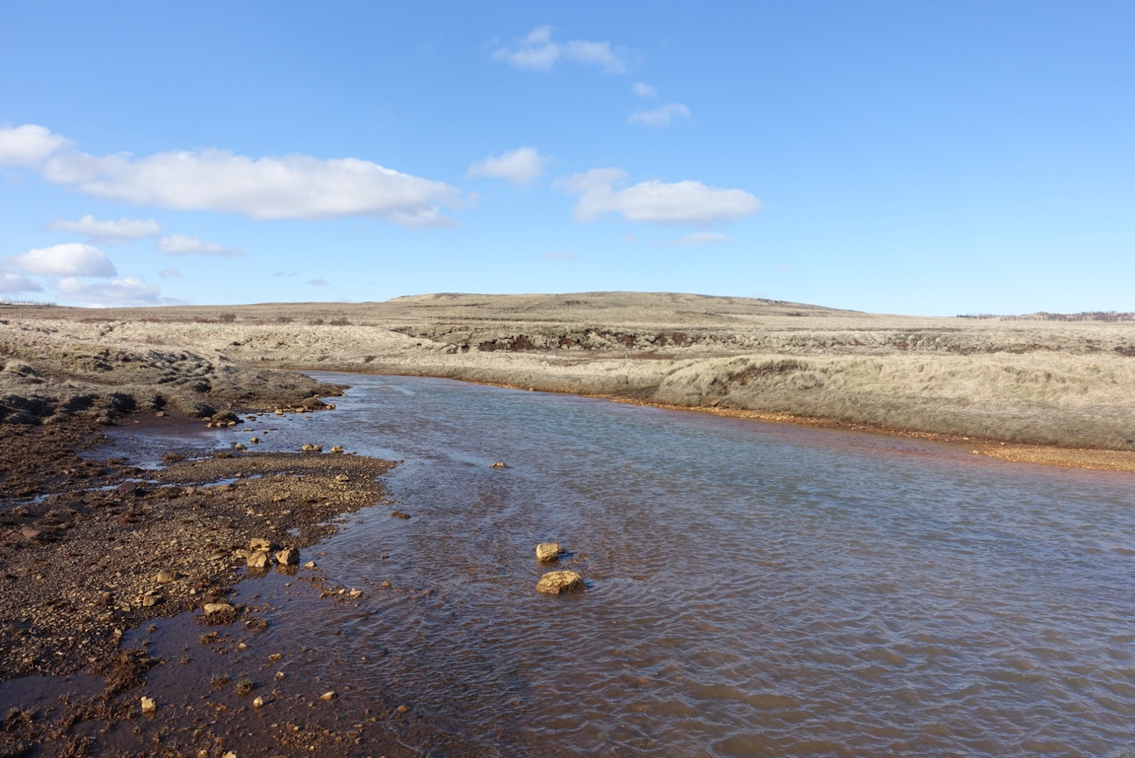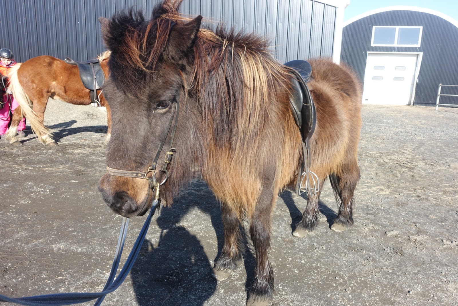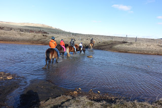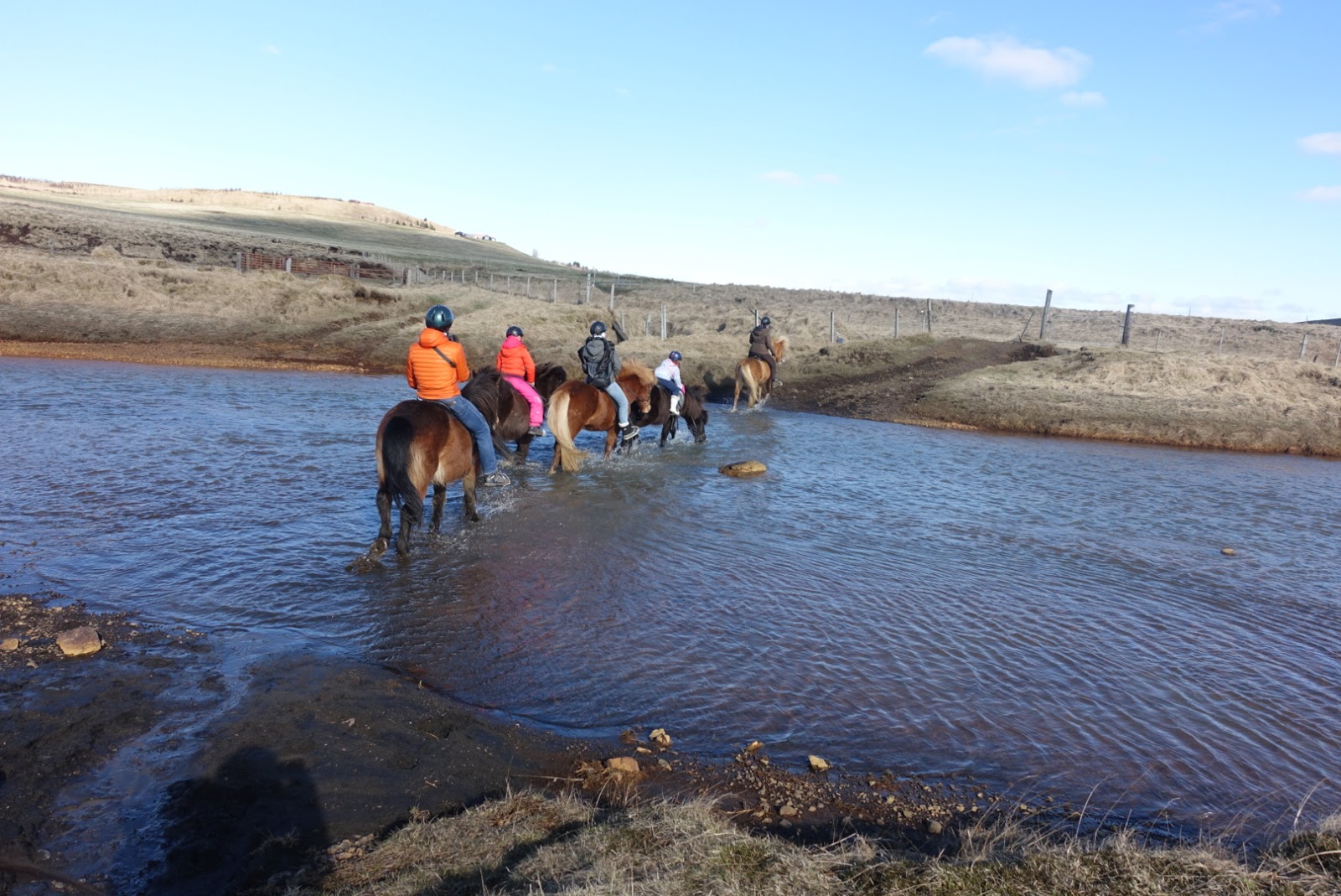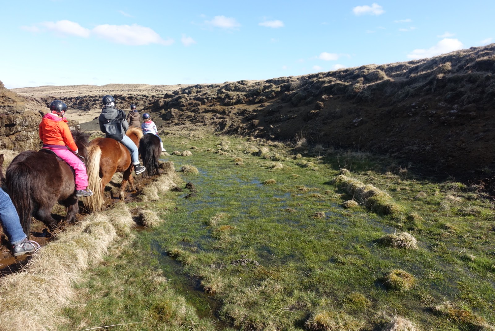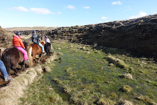 Da es noch recht früh ist, überlegen wir uns was wir noch unternehmen könnten. Wir beschliessen, dass wir uns noch ein typisches Islanderlebnis gönnen. Wir fahren auf einen Reiterhof und begeben uns auf einen Ritt mit den Isländern durch die Landschaft von Hella. Wir reiten durch einen Bach und einen kleinen Canyon. Ich versuche einige Fotos zu machen, was gar nicht so einfach ist.