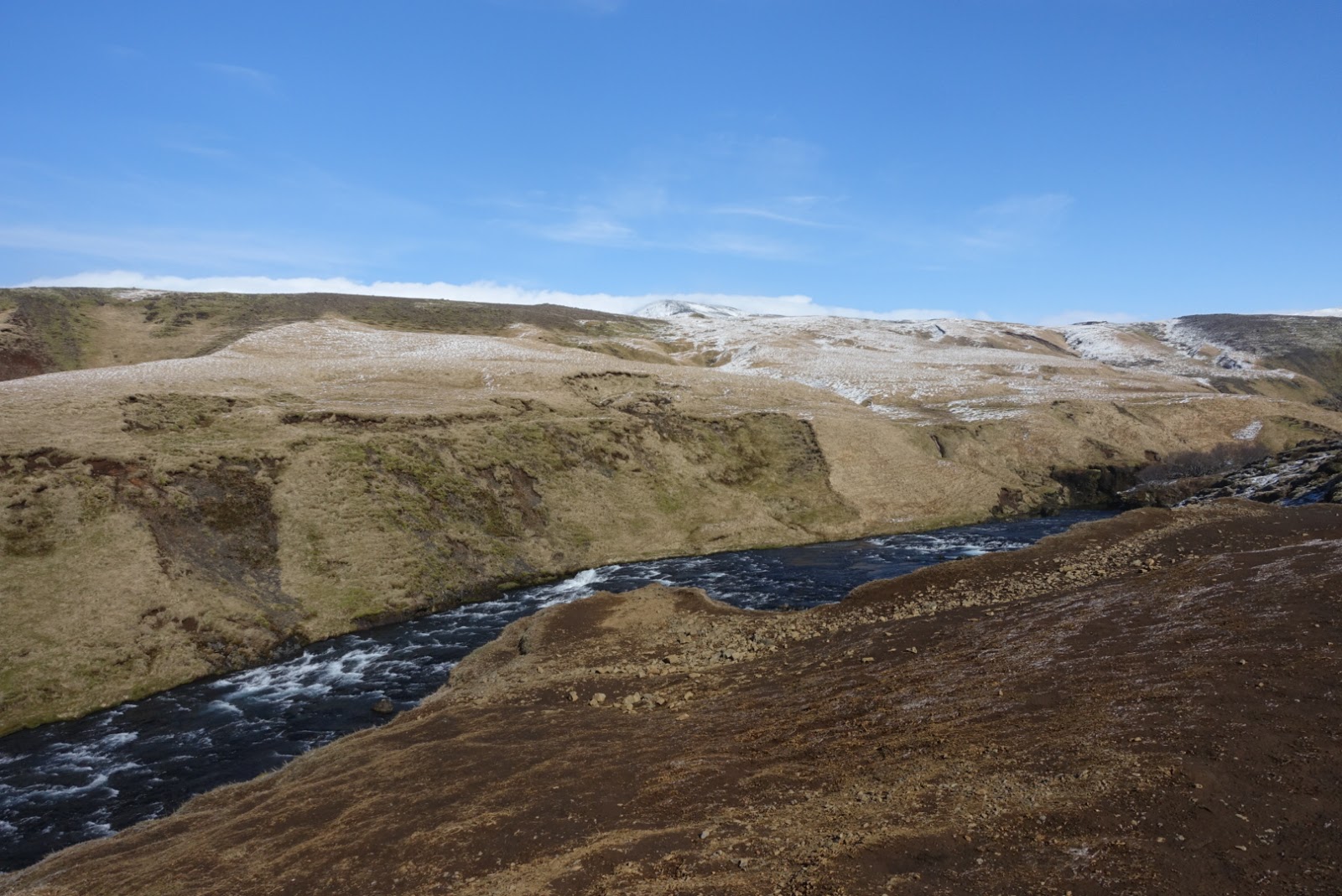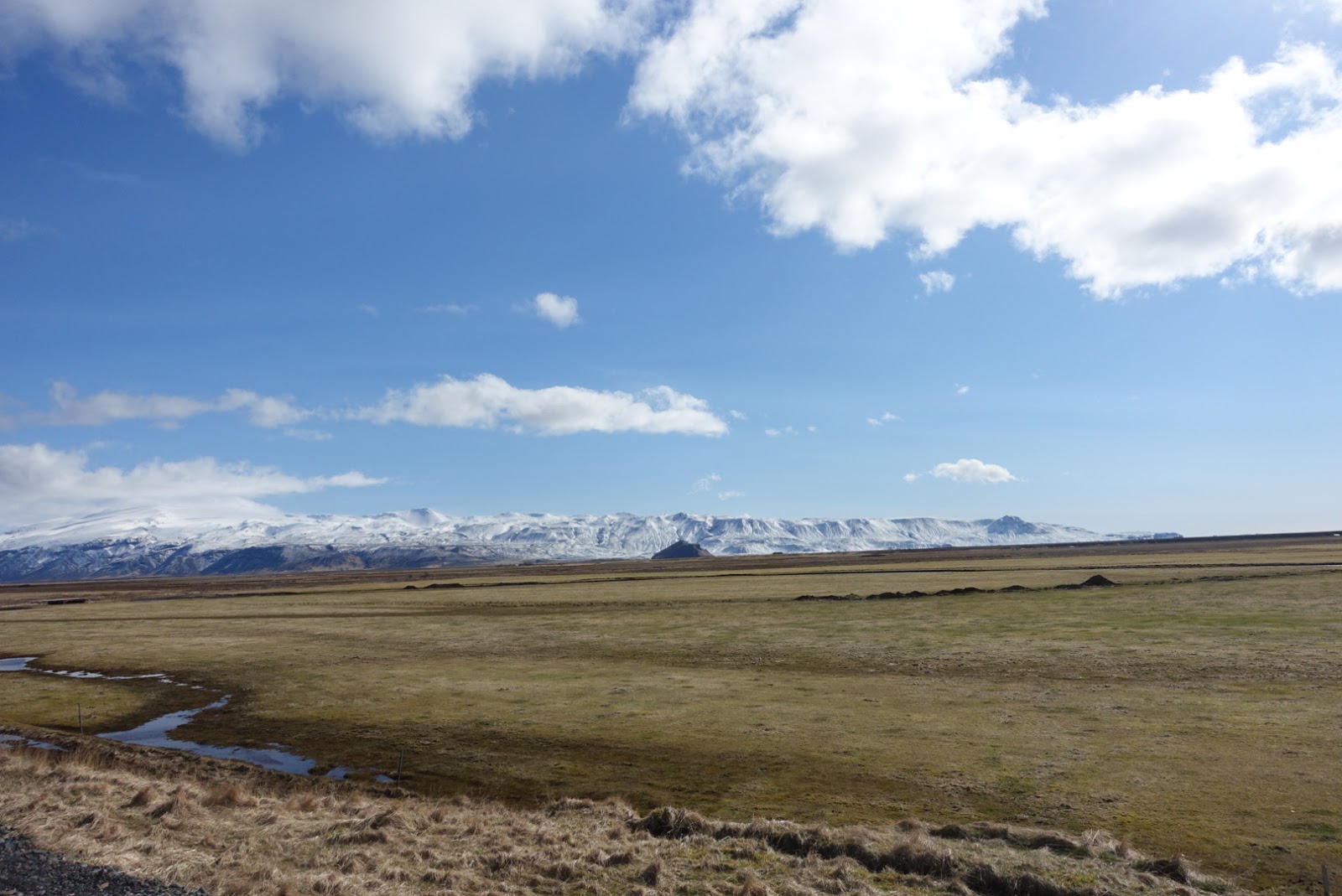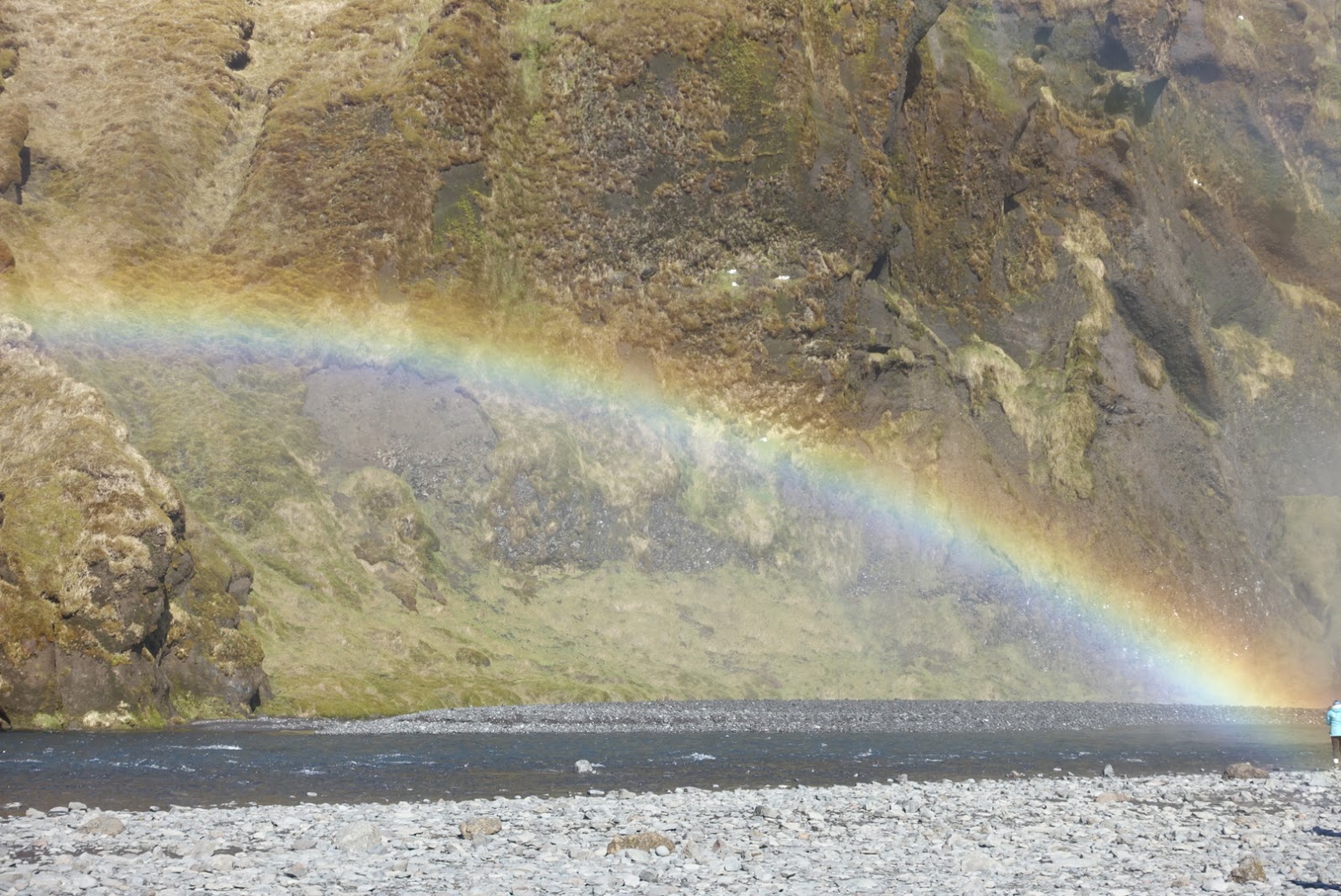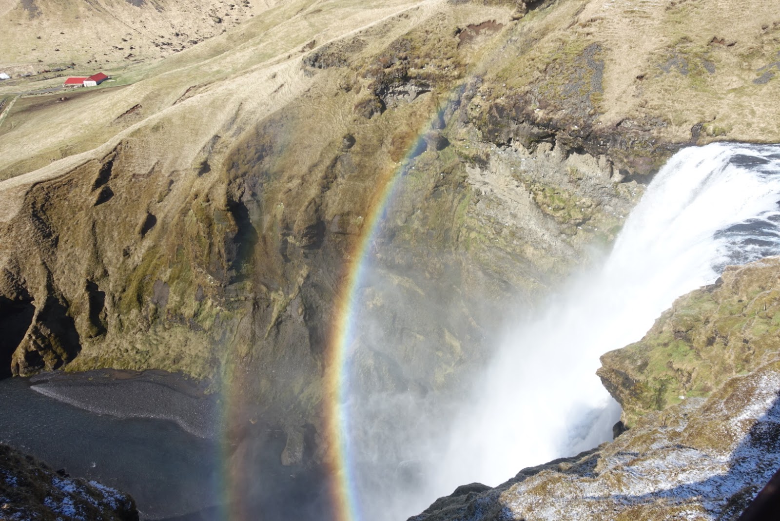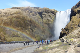 Weiter geht es zum nächsten Wasserfall. Der Skogafoss rauscht 62 Meter über die Felsen am Weststrand von Skogar hinweg. Bei Sonnenschein wird man zudem mit mehreren Regenbogen entlang des Skogafoss belohnt. Der Legende nach hat der Sidler Prasi eine Kiste voller Gold hinter dem Wasserfall versteckt. Trotz heftigem Wind haben wir das Glück und geniessen den Anblick bei Sonnenschein und blauem Himmel. Nur Fotos ohne andere Menschen zu machen, ist auch hier unmöglich. Wir erklimmen die steilen Stufen entlang des Wasserfalls um diesen auch noch von oben zu betrachten. Oben angekommen erwartet uns ein kräftiger Wind mit einer Stärke die wir in der Schweiz nur selten erleben. Der Wind bläst uns so stark um die Nase, dass wir alles festhalten müssen. Das Atmen fällt mir teilweise fast schon schwer. Problemlos können wir uns in den Wind legen ohne umzufallen. Wir nehmen den Weg nach unten wieder in Angriff und geniessen im Auto unser Mittagessen. Die Reste vom Abendessen haben wir im Auto wärmen lassen. So können wir ein lauwarmes Essen geniessen. Solarkraft ausgenützt ?