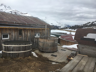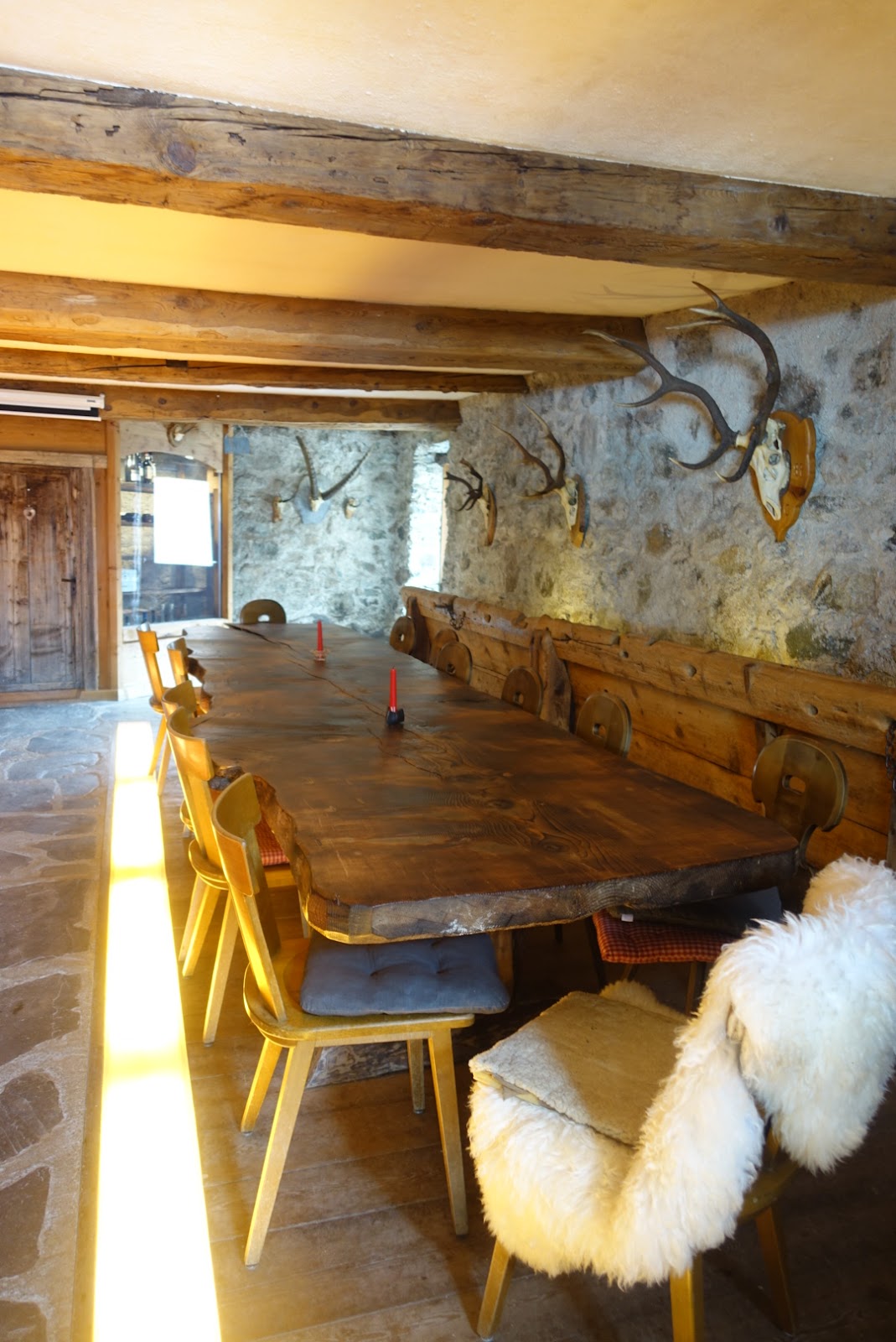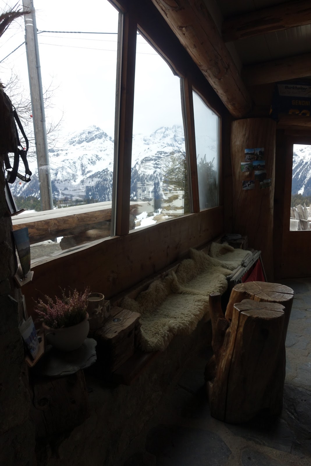 Auf der Alp Flix oben angekommen, haben wir unsein Restaurant gesucht. Auf der Suche danach hat die „ Turnschuhfraktion“ nasse und kalte Füsse bekommen. Ich konnte dank meinen Lowa Wanderschuhe ohne Probleme durch das Wasser waten. Sabrina und Nadja waren etwas voraus und haben auf der verschlafenen Alp Flix dann doch noch ein gemütliches und offenes Restaurant gefunden. Die Einrichtung war sehr lauschig. Auf den Bänken waren Felle ausgelegt und ein offenes Kaminfeuer sorgte für wohlige Wärme. Zudem bestand die Möglichkeit am Feuer die nassen Socken und Schuhe zu trocknen.