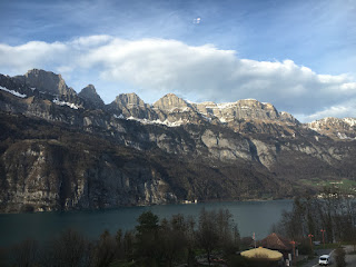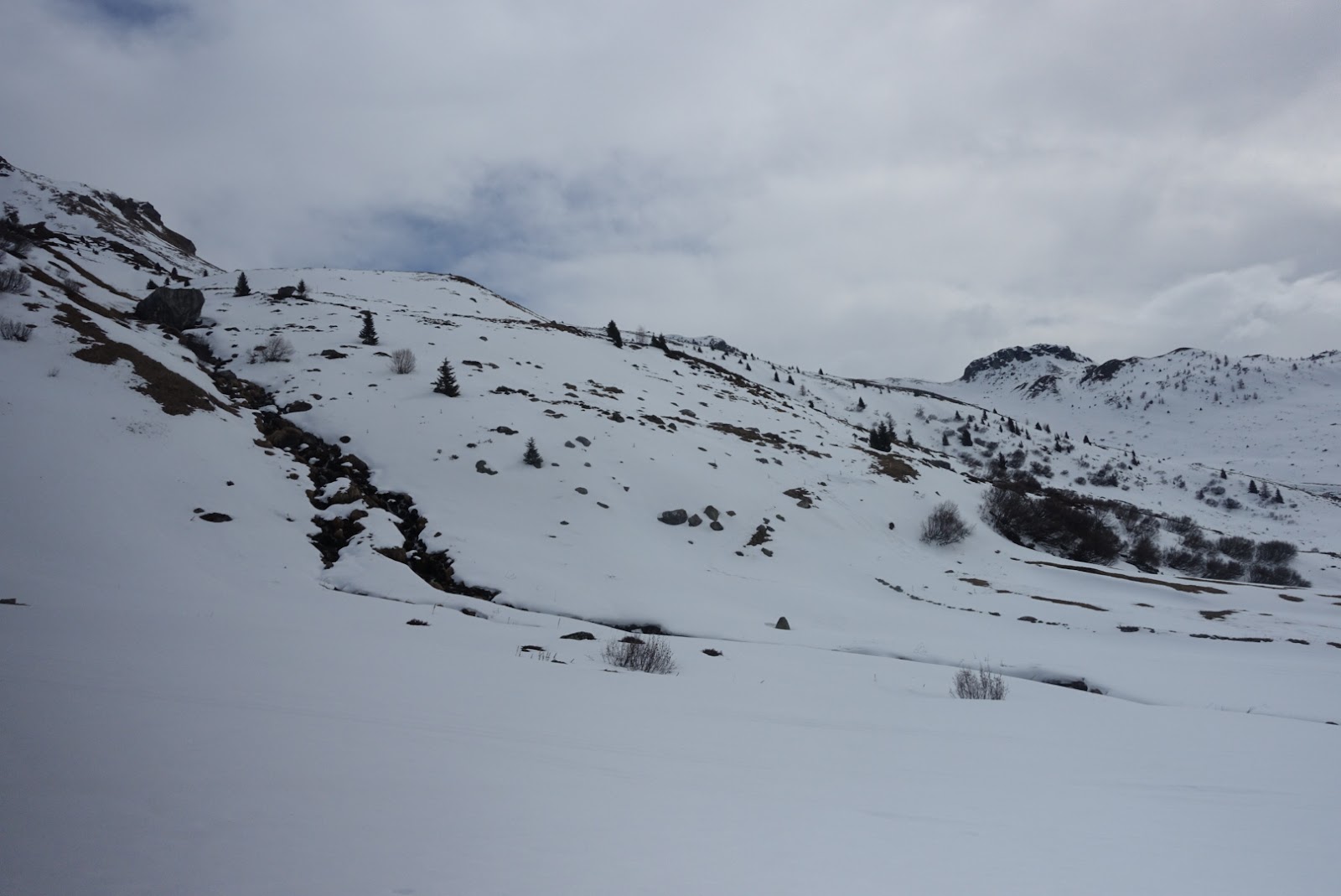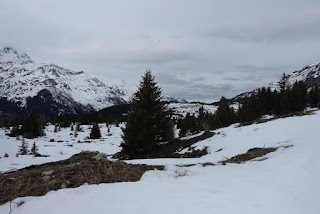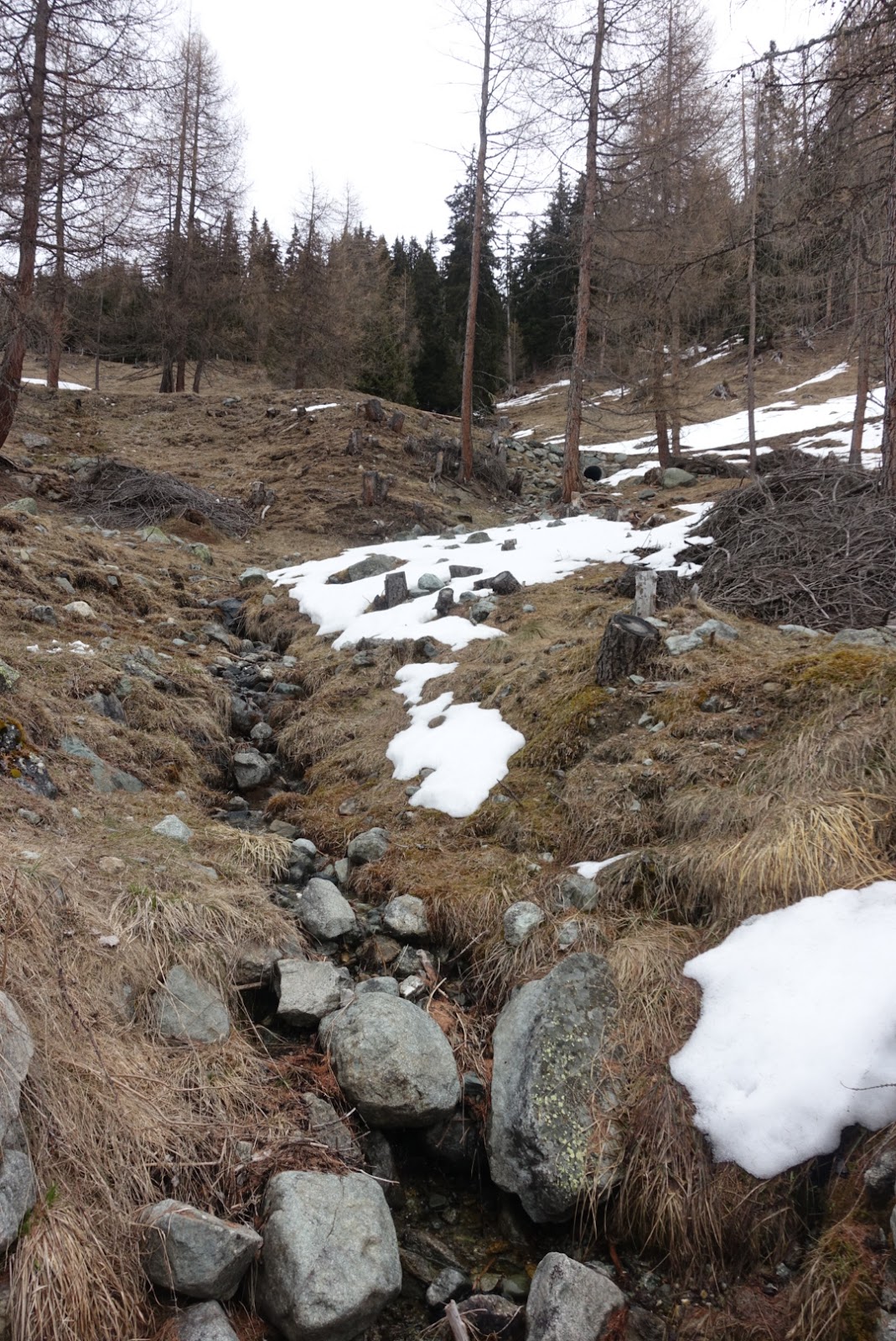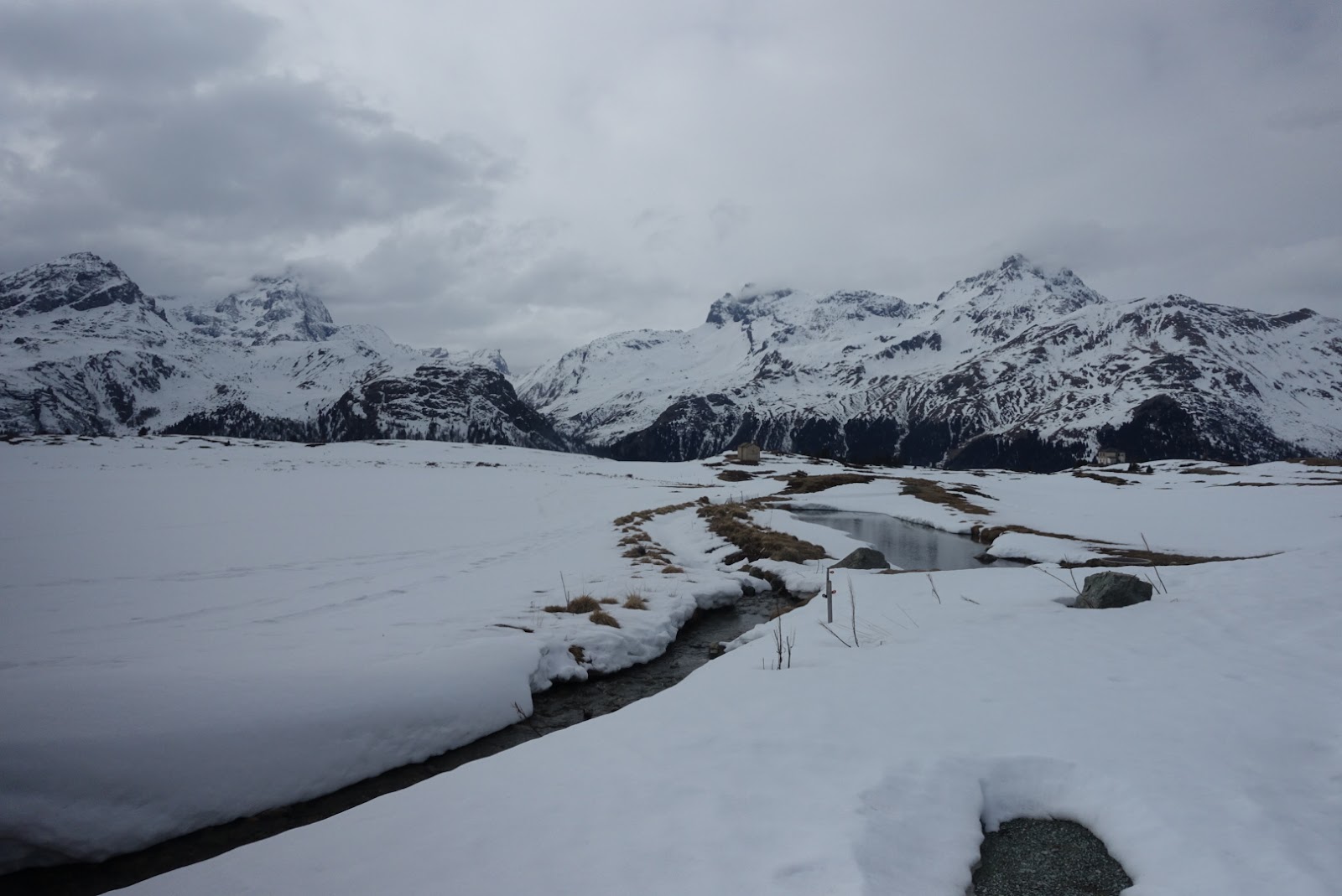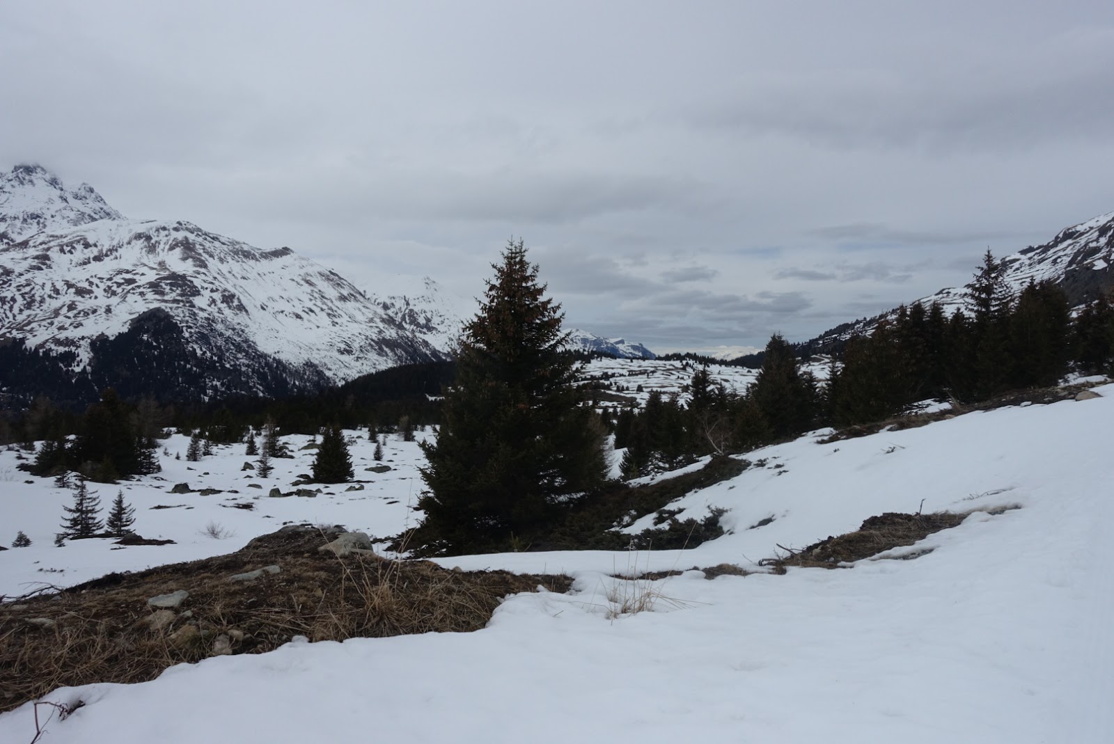Nach der verdienten Bündner Gersten Suppe haben wir uns auf den Rückweg gemacht. Damit wir nicht wieder durch den Schneematsch und die Pfützen laufen mussten, haben wir einen „kleinen“Umweg genommen. Dieser erwies sich dann doch länger als gedacht. Für mich selber hat sich dieser aber gelohnt, da wir so die Aussicht auf die Berge länger geniessen konnten.