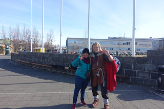 Unten angekommen machen wir noch ein Foto mit einem Wikinger der Strassenmusik macht. Sarah hat sich ein Foto von einem Isländer gewünscht und das bekommt sie nun.
