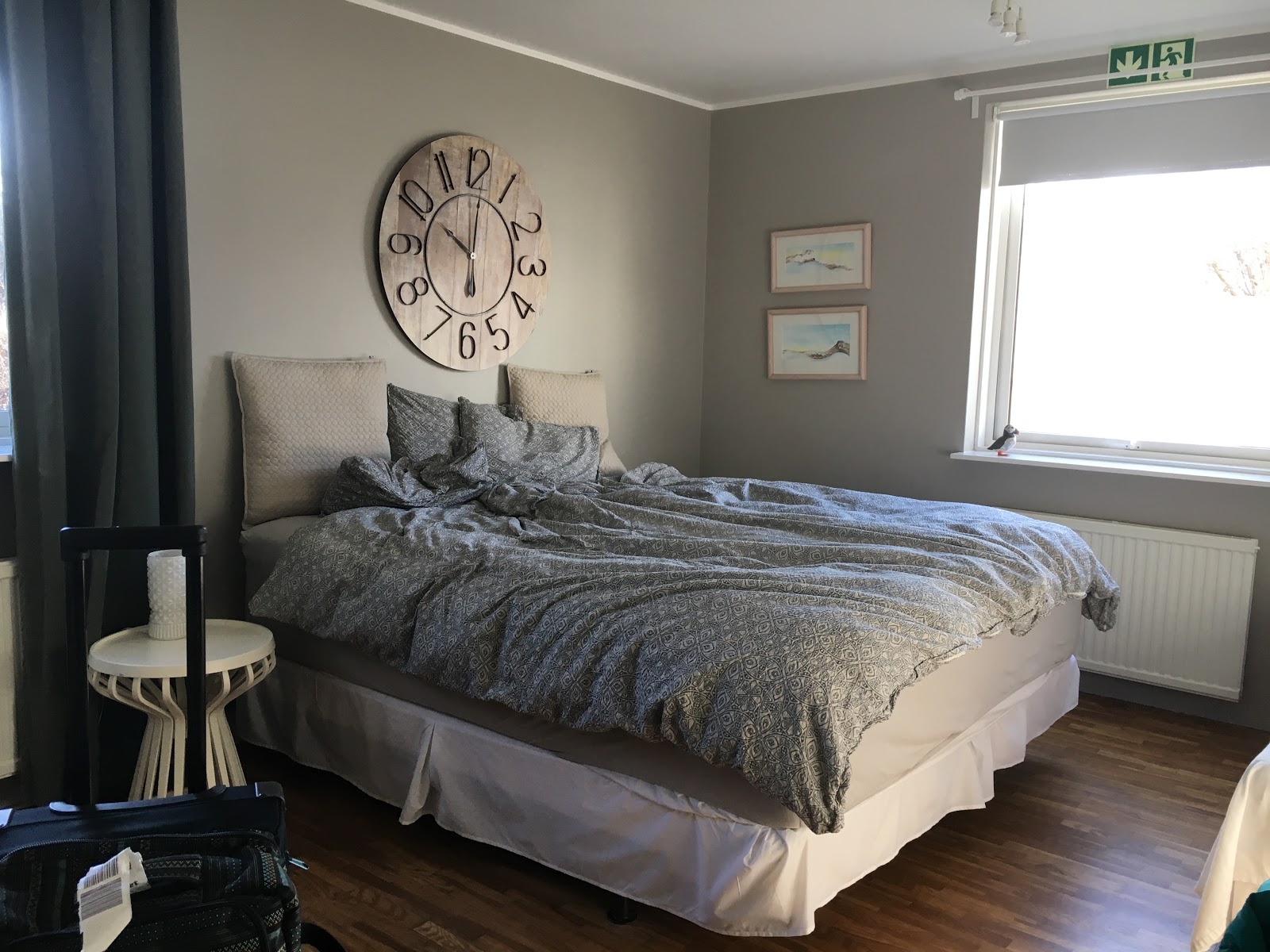 Wir staunen nicht schlecht, als wir unsere Unterkunft besichtigen. Wir werden freundlich von Elin begrüsst. Die Unterkunft ist einfach der Hammer. Vor allem das Bett… ein riesiges Boxspringbett wird uns die Träume versüssen. R. kann nicht anders und springt mit einem riesen Satz gleich ins Bett. Wir haben die Unterkunft für uns alleine. Das zweite Zimmer ist zurzeit noch im Umbau. Wir beschliessen, dass wir das Bett gleich mit nach Hause nehmen.