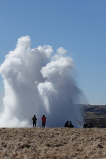 Der zweite Stopp machen wir beim Geysir. Die berühmteste Attraktion in Island ist die heisse Sprungquelle, welche bereits seit 800 Jahren aktiv ist. Der Geysir spuckt teilweise eine Fontäne von 80m hoch in die Luft. Seit 1916 ist er jedoch in einer ruhigeren Phase. Der zuverlässige Wasserspucker Strokkur liegt zum Glück gleich nebenan. Dieser spuckt zwar nur eine Fontäne von 15-30 m hoch, dafür regelmässig alle 5-10 Minuten. Wir parkieren auf dem Parkplatz und kommen nach wenigen Metern zu einem kleinen blubbernden Wasserloch. Da einige Touristen an diesem Ort stehen, gehen wir davon aus, dass dies hier der Strokkur ist. Wir sehen das Schild, welches uns bestätigt an der richtigen Stelle zu stehen. Wir zücken unsere Kameras und warten ab. Lange dauern wird’s zum Glück ja anscheinend nicht. Nach 10 Minuten schaue ich das erste Mal auf die Uhr. Bisher kommt immer eine kleine Fontäne von knapp 30-60 cm hoch; mehr passiert jedoch noch nicht. Wir sind aber beide überzeugt, dass der Strokkur gleich aktiver wird. Nach 30 Minuten ist immer noch nichts passiert. Langsam werden die Finger doch etwas kalt. Trotzdem wollen wir die Stelle jetzt nicht verlassen, sonst verpassen wir sicher etwas. Nach einer Stunde beschliesst R. mal den Weg weiter zu gehen. Ich komme auf die Idee auf maps.me mal nachzusehen. Kaum ist meine Reisebegleitung weg, sehe ich, dass wir die ganze Zeit am falschen Ort standen. In diesem Moment kommt R. wieder und sagt mir, dass nur wenige Meter weiter der Strokkur wirklich gerade aktiv war. Nach über einer Stunde vergeblichen Wartens, stehen wir also endlich am richtigen Ort und können den Strokkur in Aktion erleben. Fotos ohne Touristen zu machen wird auch hier ein schier unmögliches Unterfangen. Wir bestaunen das Schauspiel. Nach einem kurzen Souvenirshopbesuch machen wir uns noch auf den Weg zum Gullfoss.