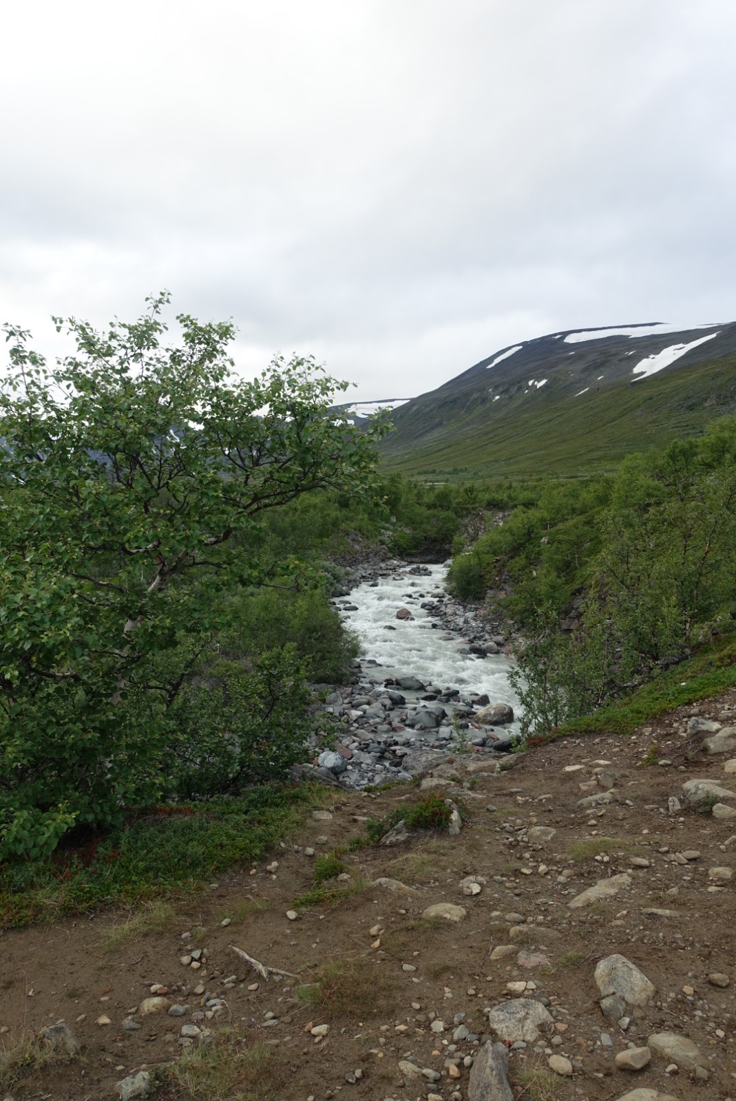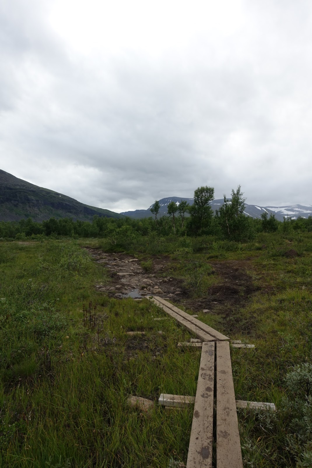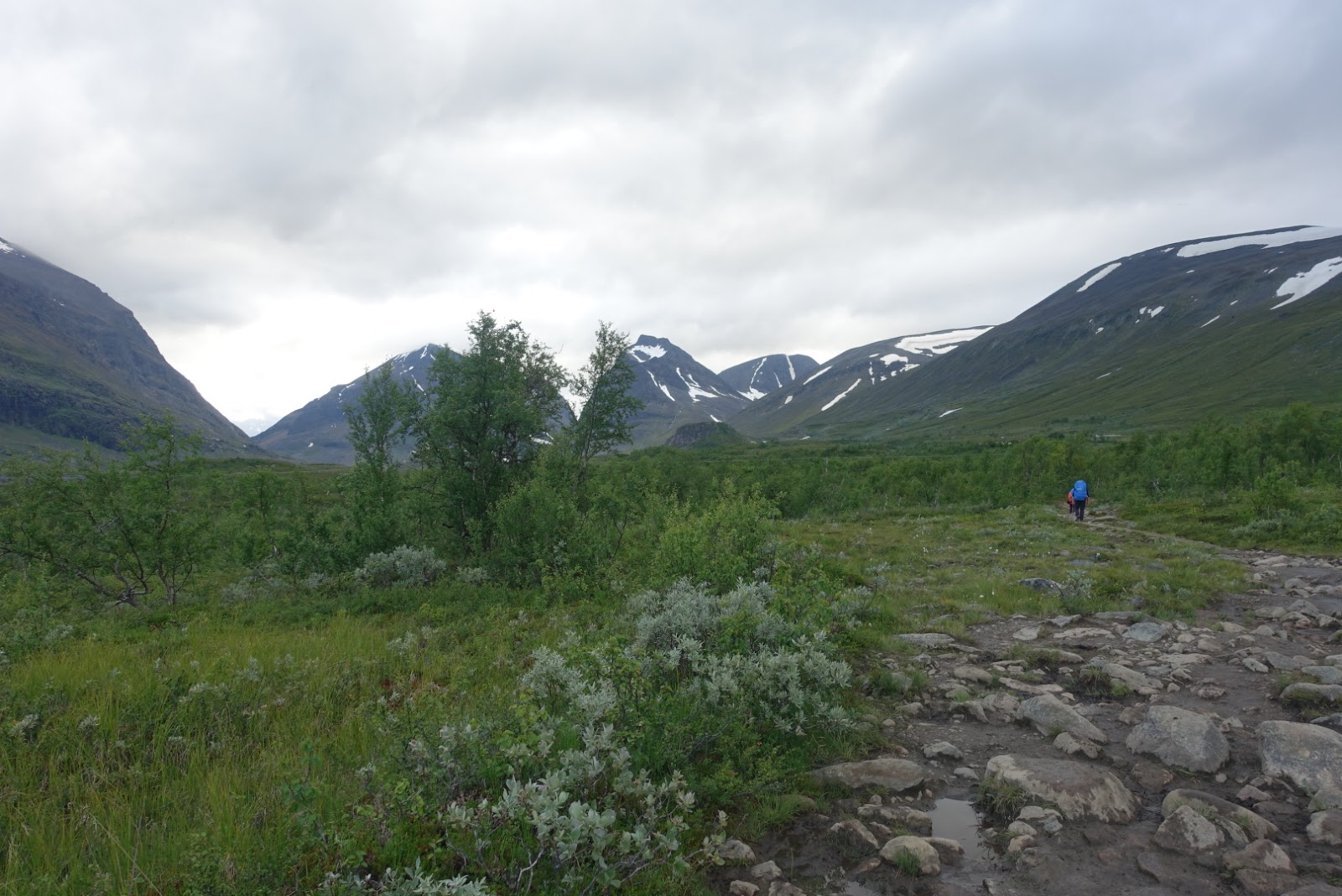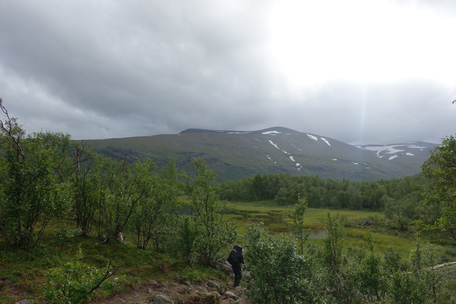 Der weitere Weg führt mich nun hauptsächlich durch waldiges Gebiet. Zum Glück habe ich mein Antibrumm in der Aussentasche eingesteckt. Wie mir bereits versprochen wurde, sind die Mücken in dieser Gegend doch sehr aktiv. Aus diesem Grund wird auch empfohlen für die erste Übernachtung erst nach dem Checkpoint das Zelt aufzustellen. Inzwischen bin ich mehrheitlich alleine unterwegs. Ab und zu treffe ich noch auf die Fjällräven Fahnen am Rucksack, aber die Masse hat sich nun gut verteilt. Ich geniesse die schwedische Landschaft, die Weitläufigkeit und die Ruhe. Ab und zu kreist zwar noch der Hubschrauber über meinem Kopf, dies empfinde ich aber nicht als störend. Nach weiteren 5h Wanderung und 19 KM erreiche ich schliesslich die Bergstation Kebnekaise. Ich hole mir meinen Stempel ab und mache eine kurze Pause. Beschliesse dann aber noch wenige Kilometer weiter zu gehen bevor ich mein Zelt aufschlage. Die meisten Teilnehmer hatten wohl den gleichen Gedanken, so dass 2km hinter der Bergstation einige Zelte stehen. Ich finde aber doch noch ein ruhiges Plätzchen.