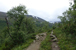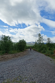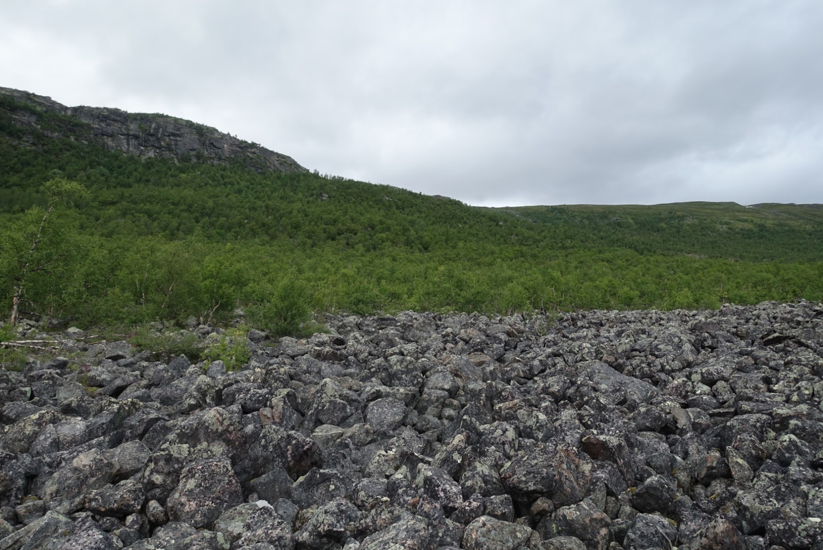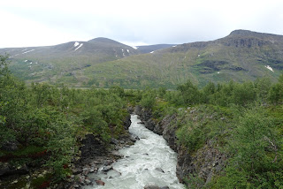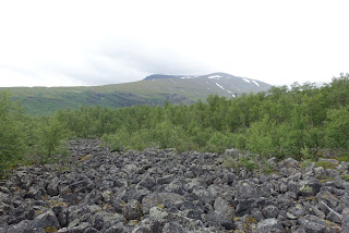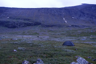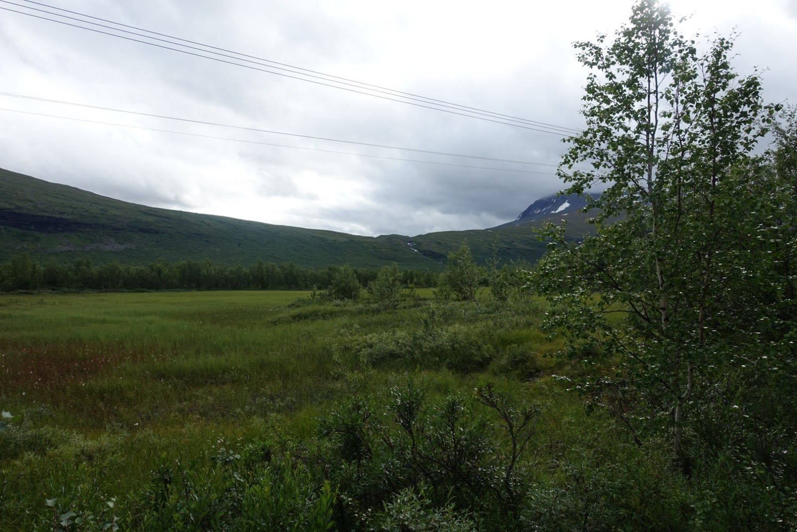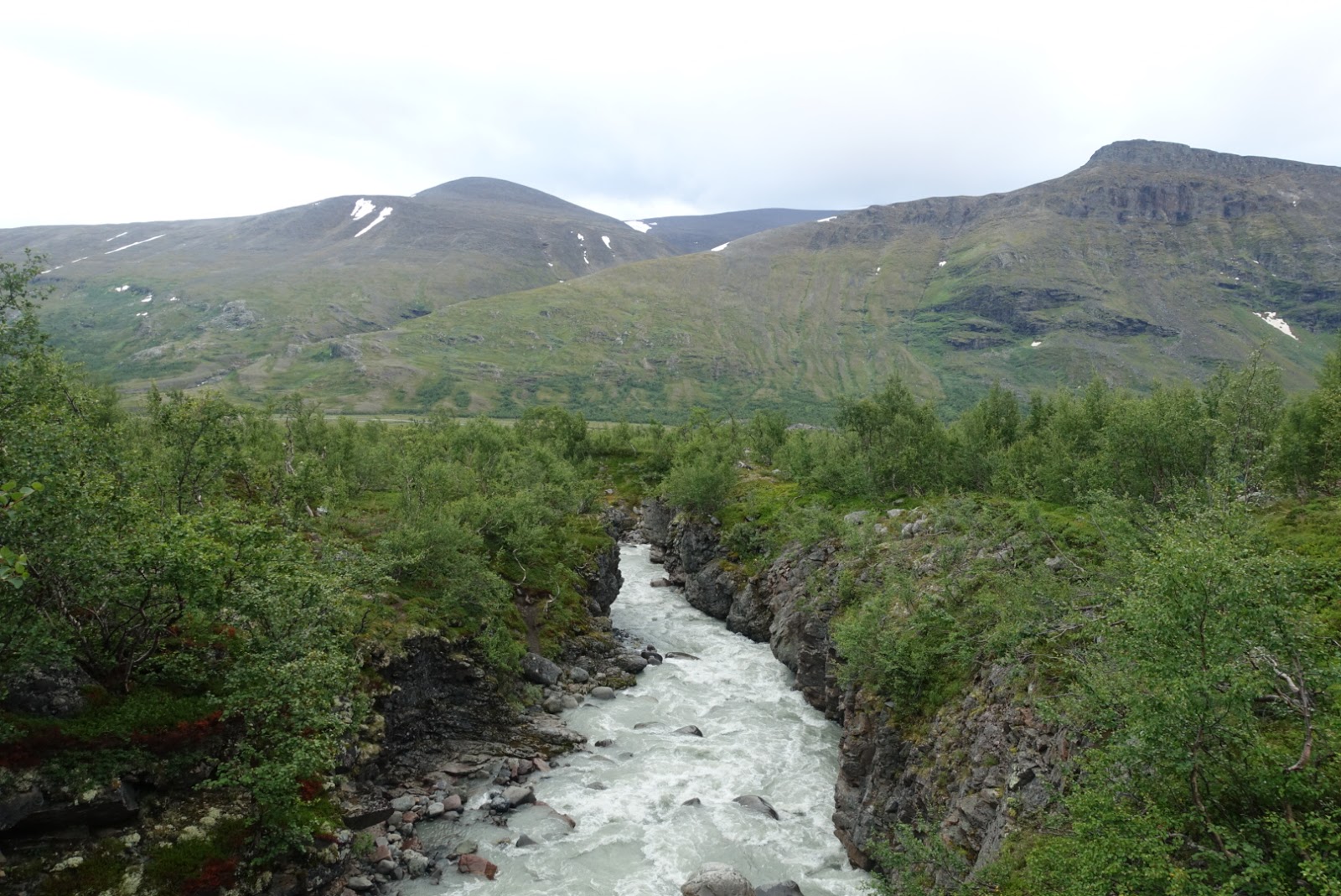 Der weitere Weg führt mich nun hauptsächlich durch waldiges Gebiet. Zum Glück habe ich mein Antibrumm in der Aussentasche eingesteckt. Wie mir bereits versprochen wurde, sind die Mücken in dieser Gegend doch sehr aktiv. Aus diesem Grund wird auch empfohlen für die erste Übernachtung erst nach dem Checkpoint das Zelt aufzustellen. Inzwischen bin ich mehrheitlich alleine unterwegs. Ab und zu treffe ich noch auf die Fjällräven Fahnen am Rucksack, aber die Masse hat sich nun gut verteilt. Ich geniesse die schwedische Landschaft, die Weitläufigkeit und die Ruhe. Ab und zu kreist zwar noch der Hubschrauber über meinem Kopf, dies empfinde ich aber nicht als störend. Nach weiteren 5h Wanderung und 19 KM erreiche ich schliesslich die Bergstation Kebnekaise. Ich hole mir meinen Stempel ab und mache eine kurze Pause. Beschliesse dann aber noch wenige Kilometer weiter zu gehen bevor ich mein Zelt aufschlage. Die meisten Teilnehmer hatten wohl den gleichen Gedanken, so dass 2km hinter der Bergstation einige Zelte stehen. Ich finde aber doch noch ein ruhiges Plätzchen.