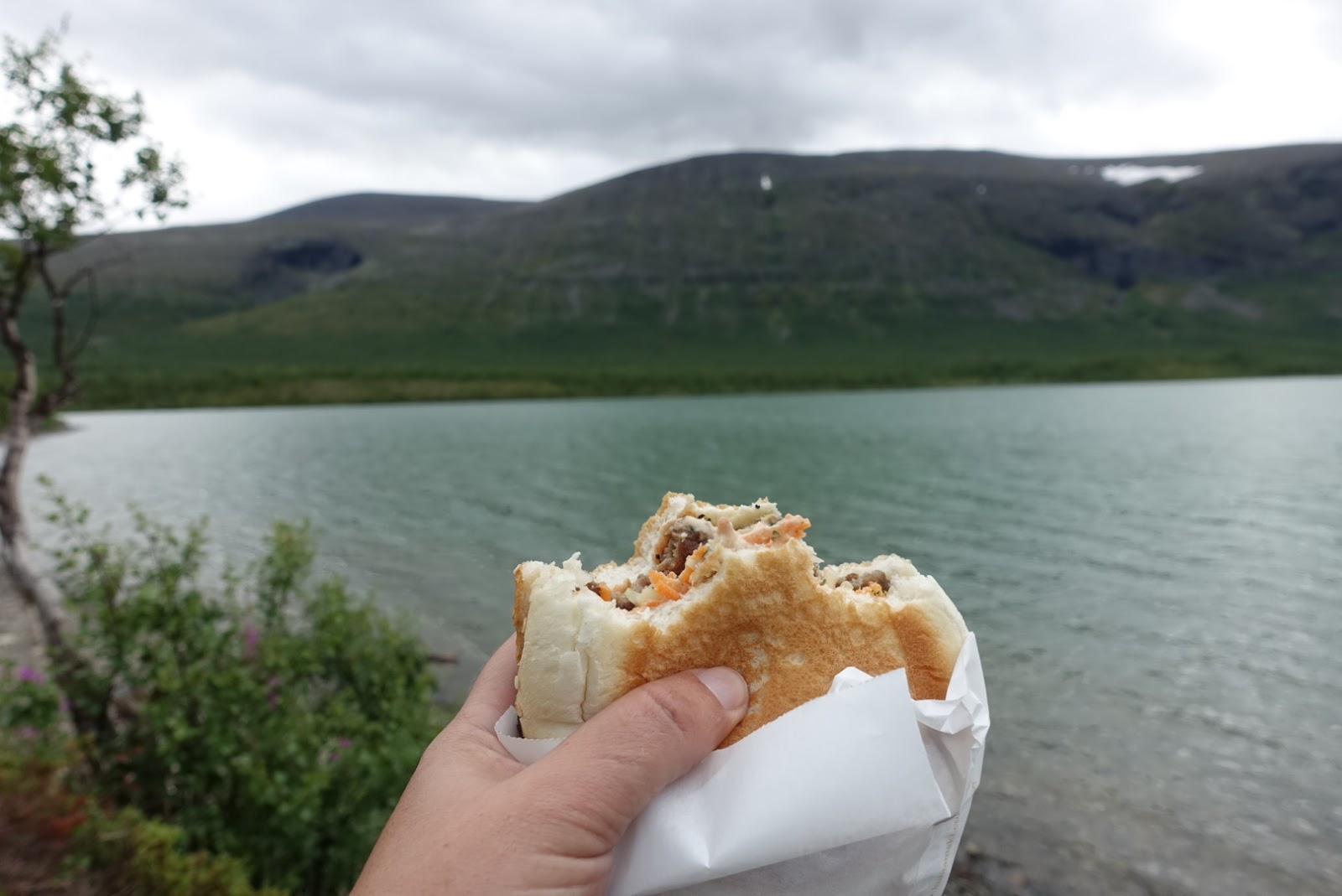 Nach ca. einer Stunde erreiche ich dann den See Ladtjojaure. Am Ufer des Sees ist der einzige samische Burger Impiss «Lap Donald» Auch ich entschliesse nun den Rentier Burger zu versuchen. Ich geniesse mein Mittagessen am Ufer des Sees. Überraschend schmeckt der Rentier Burger wirklich sehr gut. Da ich aber erst 6 Km gelaufen bin, ist meine Pause hier eher kurz. Die meisten Wandere bleiben etwas länger sitzen, so dass sich hier der Massenauflauf zum Glück nun besser verteilt.