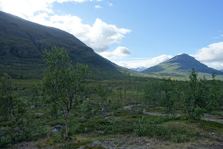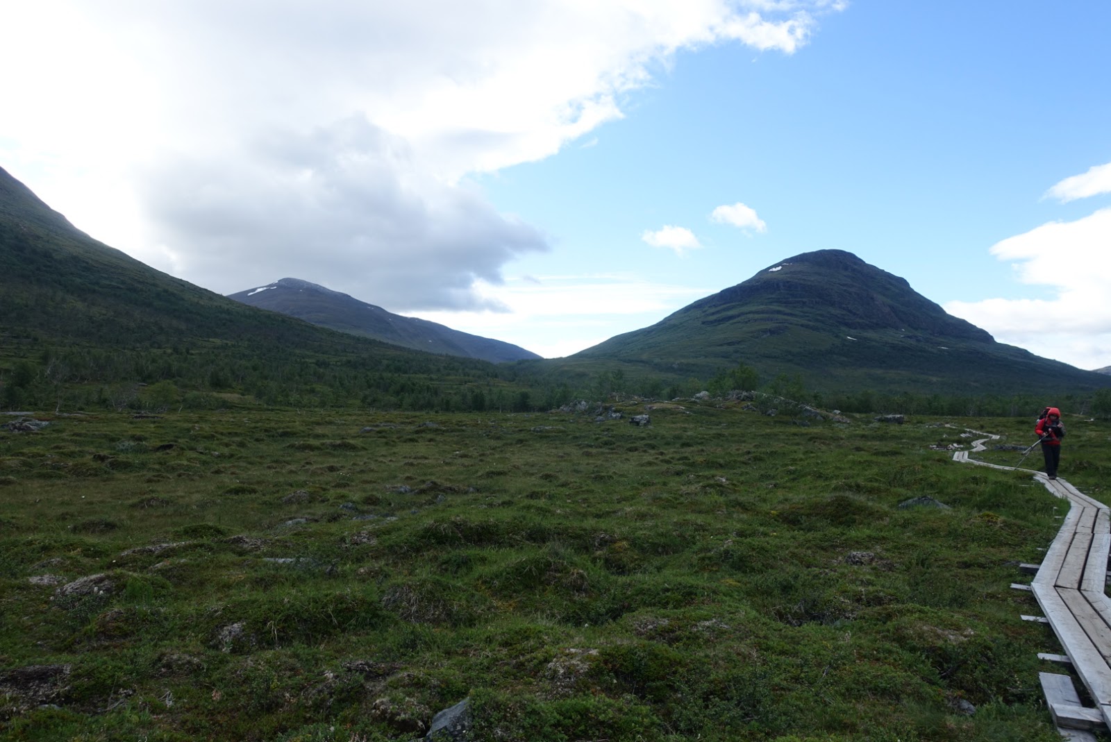 Ich starte am nächsten Morgen später als die Meisten. Nun steht also die letzte Etappe des Fjällräven Classics an. Ich beschliesse die letzten 18 km noch mehr zu geniessen als vorherigen der letzten Tage. Alle Eindrücke der Landschaft ganz fest in mein Herz zu schliessen, so dass ich noch lange davon zerren kann. Kaum habe ich den Nationalaprk betrete, spüre ich eine Veränderung. Ich weiss selber nicht genau ab wann ich auf dem E1 unterwegs bin. Doch in diesem Augenblick bin ich mir ziemlich sicher, dass ich gerade den E1 betreten habe. Damit ich es später prüfen kann, mache ich noch ein Foto vom Wegweiser.
