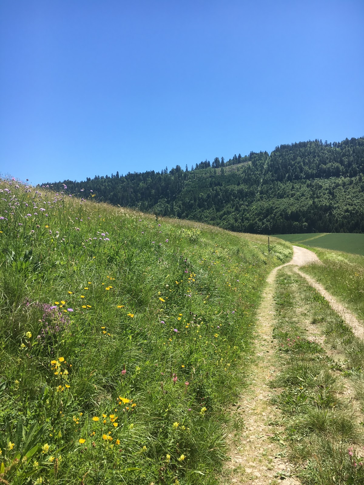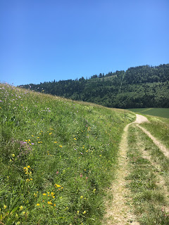 So konnte ich dann zumindest den Sonntag nutzen um auf Entdeckungstour zu gehen. Das Wetter zeigte sich von seiner schönsten Seite. Für Shila eher schon zu heiss. So machte ich mich auf die Suche nach einer, uns noch unbekannten, Badegelegenheit. Ich bin im Netz auf die Gorges de Covatannaz gestossen. (Gorges=Schlucht) Mit dem Auto geht es Richtung St. Croix. Wir starten unsere kleine Wanderung und laufen in die vom Wegeweiser gezeigte Richtung zur Schlucht. Wir laufen zuerst über einige Felder und Wiesen. Es geht stetig, aber nicht zu steil, abwärts. Der Wanderweg eignet sich auch für ungeübte Wanderer. Nach ca. einer halben Stunde erreichen wir die Schlucht.