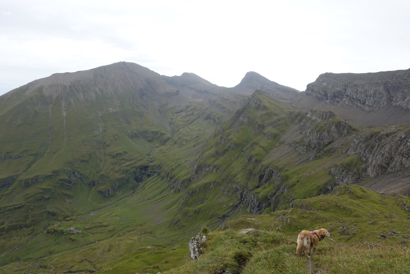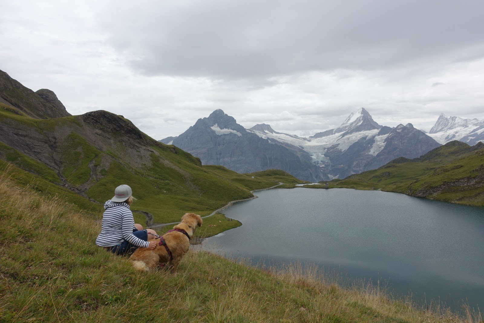 Hier machen wir auch unsere Mittagspause mit Aussicht auf den See. Das Wetter wird immer ein bisschen schlechter. Ich mache mir da schon etwas Gedanken, ob wir wirklich bis zur Axalp laufen sollen. Als zwei Wanderer uns entgegenkommen, frage ich nach ob sie von der Axalp hier hinauf gewandert sind. Sie bestätigen dies und meinen dann gleich, dass dieser Weg für Hunde nicht machbar sei.