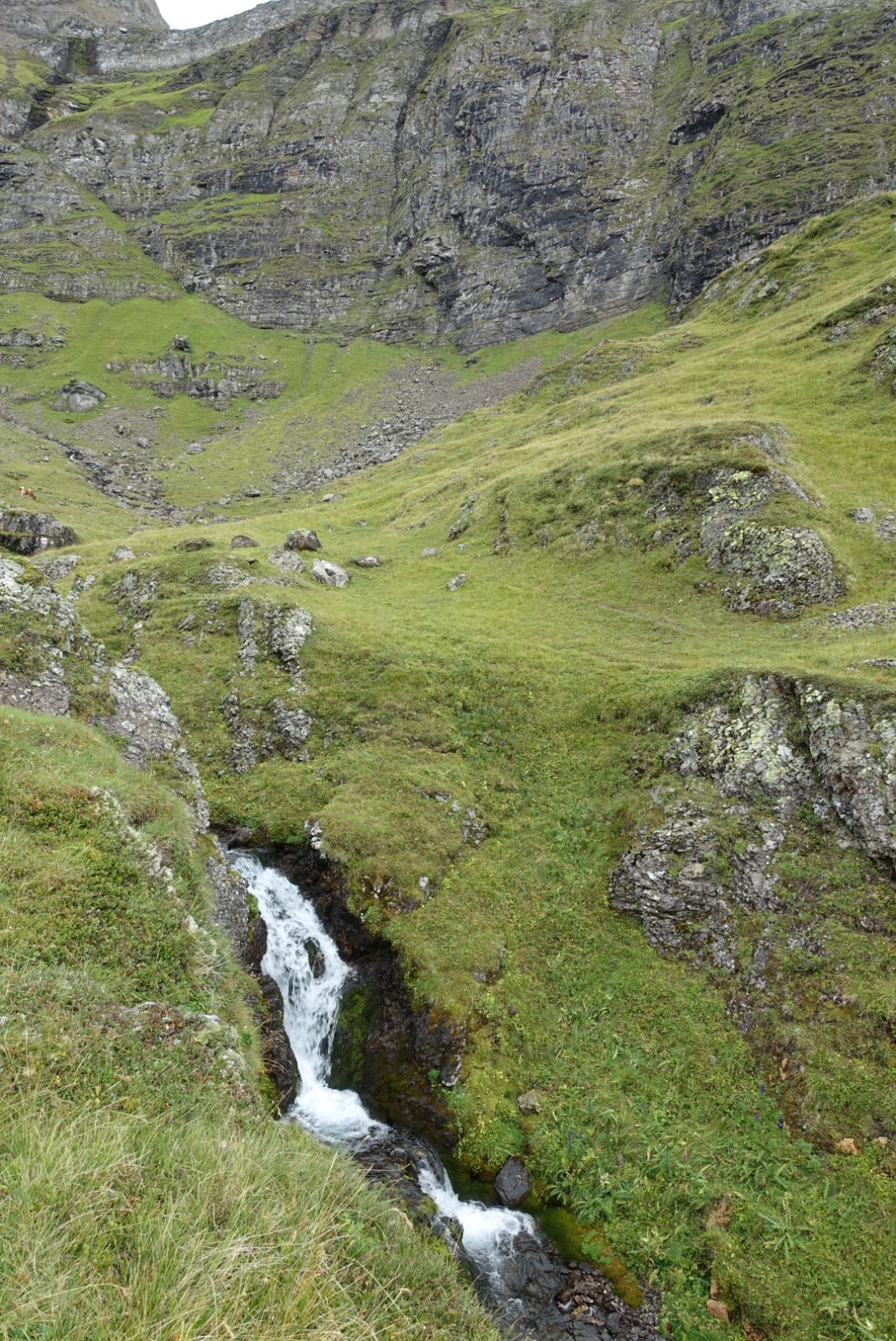 Trotzdem geniesse ich noch die tolle Sicht rund um mich herum. Im Oberberg hat es einige kleine Wasserfälle und ich nehme mir noch kurz Zeit um Fotos zu machen. Wir laufen entlang des Ochsenläger und erreichen nach einem weiteren Anstieg das Lütschentäli. Von hier aus ist der Weg bis zur Chüemad sehr flach und so kommen wir schneller voran. Kurz nach der Chüemad geht es aber erneuert ziemlich steil runter. Dieses Mal über Steinschotter, was das ganze sehr mühsam macht. Gerade Mama rutscht öfters auch. Auch Shila ist nun müde und will nur noch nach Hause.