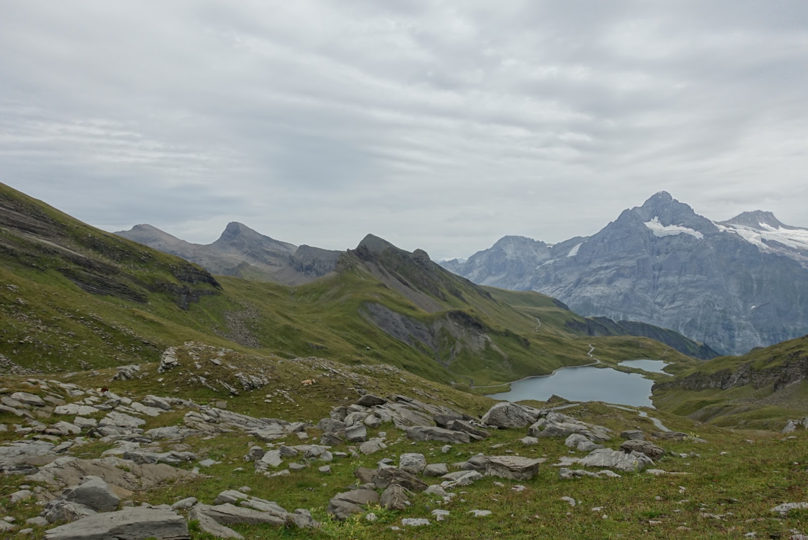 Wir liessen uns aber nicht abhalten und fuhren mit Zug und der Gondel auf die First. Trotz des mässig tollen Wetters waren erstaunlich viele Wanderer unterwegs; die meisten davon Touristen. Wir liefen bis an den Bachalpsee; hierfür benötigten wir ca. 50 Minuten. Geplant wäre es gewesen am See eine Pause zu machen. Da wir aber beide noch nicht wirklich Hunger haben und es am See sehr viele Touristen hat, laufen wir noch etwas weiter Richtung Faulhorn. Ein kurzer, aber zeitweise sehr steiler Anstieg erwartet uns. Kurz vor dem Faulhorn verlassen wir den Weg um Richtung Axalp zu laufen.