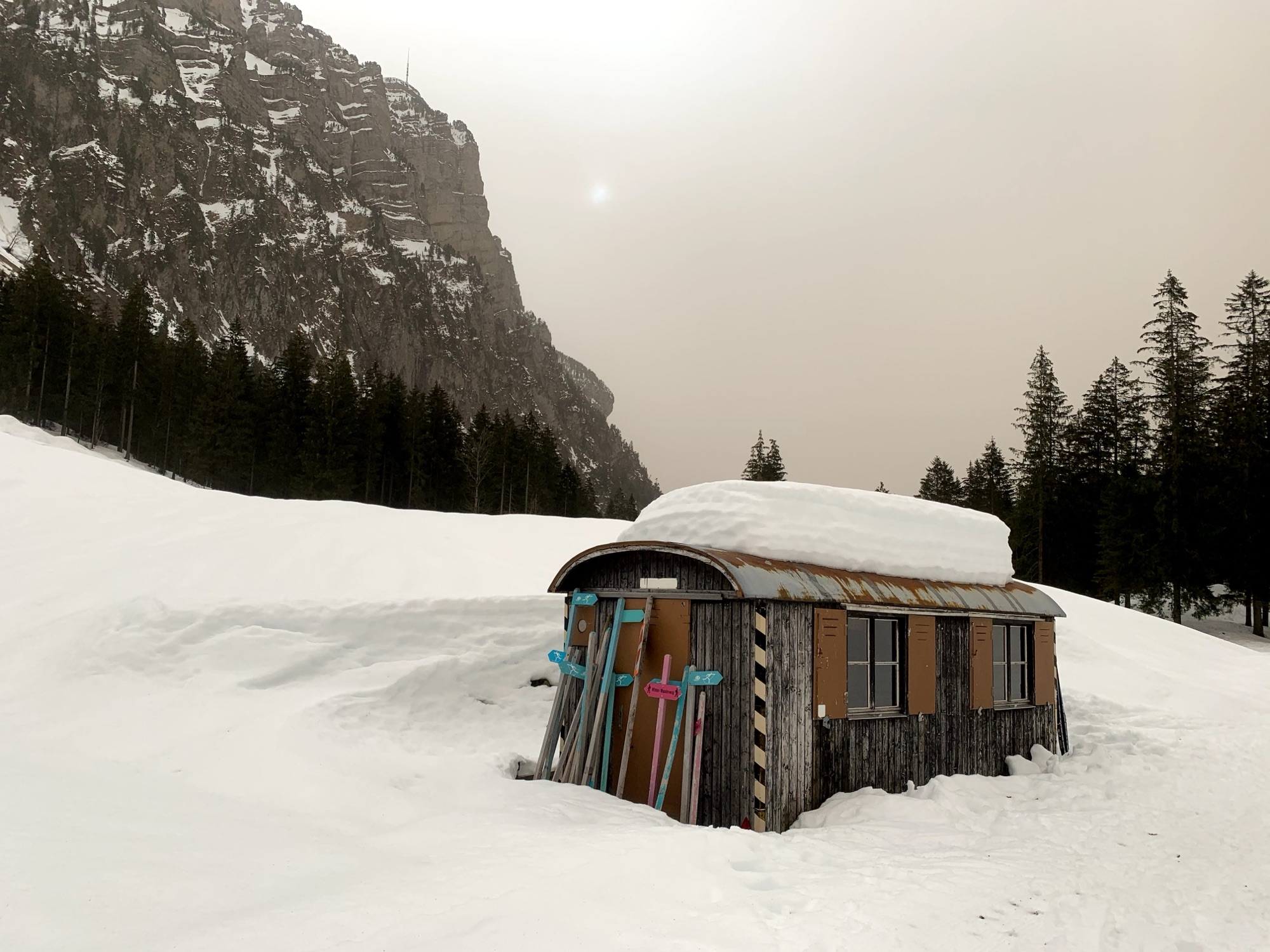 Kleine Alphütte im tief verschneiten Justistal mit Skiern an der Wand, umgeben von steilen Felswänden im Berner Oberland.