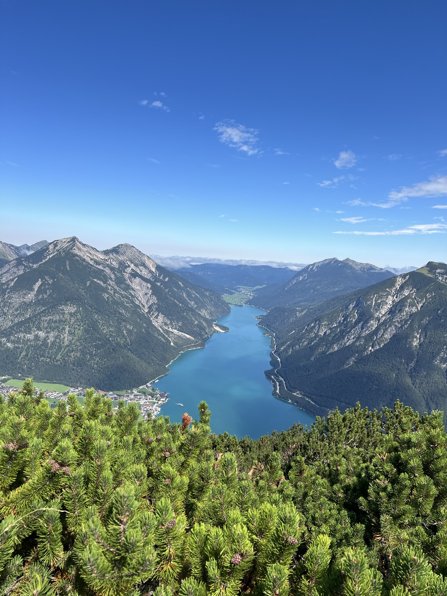 Aussicht über den ganzen Achensee: Klare Sicht auf See und Berge, grüne Wälder und steile Hänge prägen das Panorama.