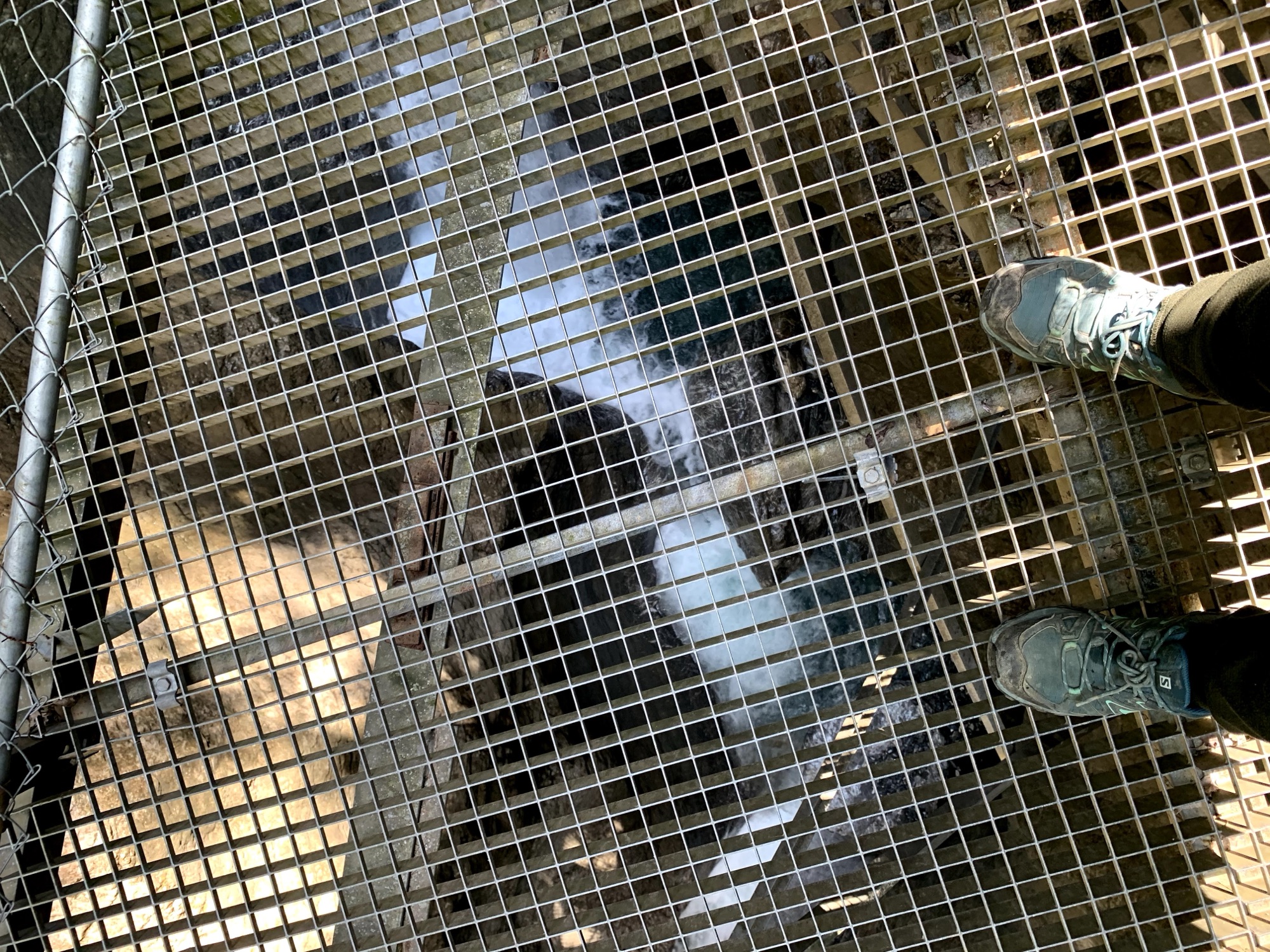 Blick durch den Gitterboden in der Cholerenschlucht Adelboden auf das darunter fliessende Wasser.