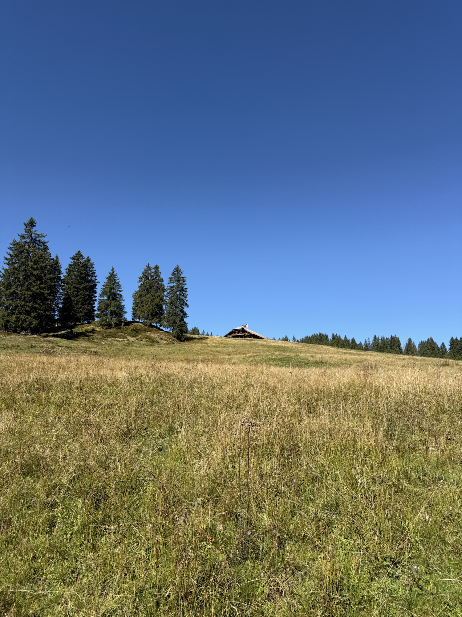 Sanfte Wiesenlandschaft auf der Lombachalp mit einer Hütte auf der Anhöhe, umgeben von Tannen und blauem Himmel.