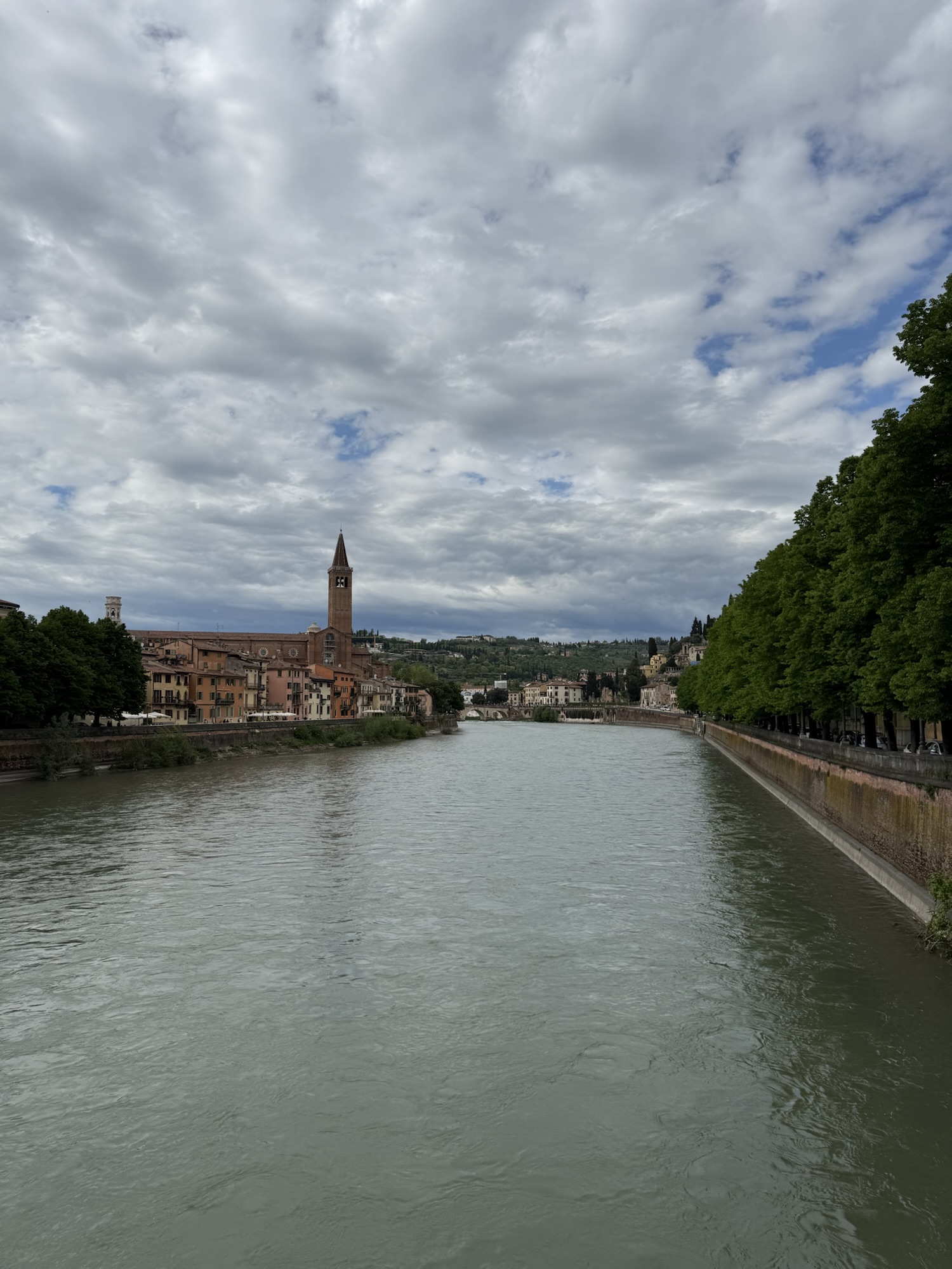 Blick über den Fluss Adige in Verona mit der Skyline der Altstadt und bewölktem Himmel.