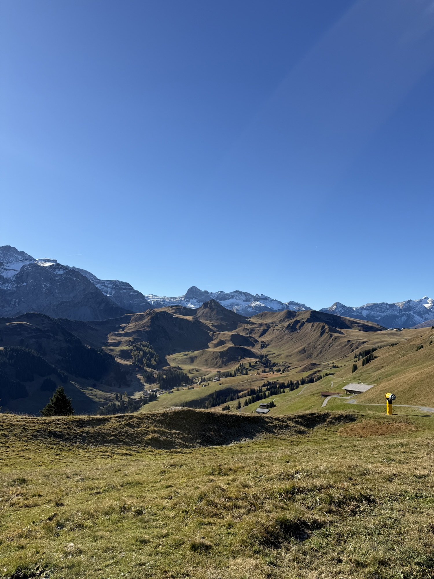 Panoramablick über das grüne Tal Richtung Adelboden – sanfte Hügel und erste Schneereste auf den Gipfeln.