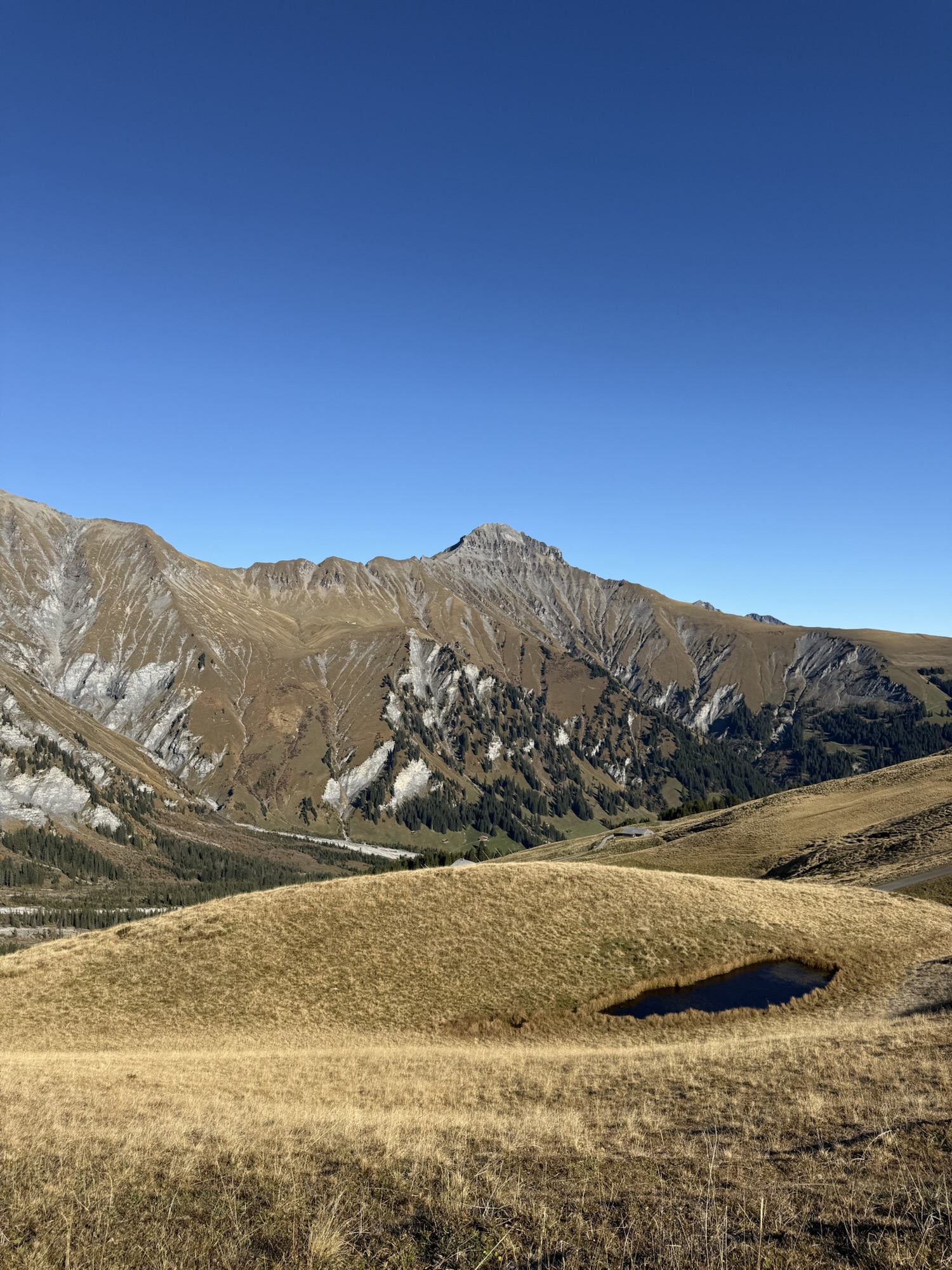 Blick über das Hochplateau mit kleinem Bergteich – gegenüber markante Felsstrukturen der Engstligenalp-Region.