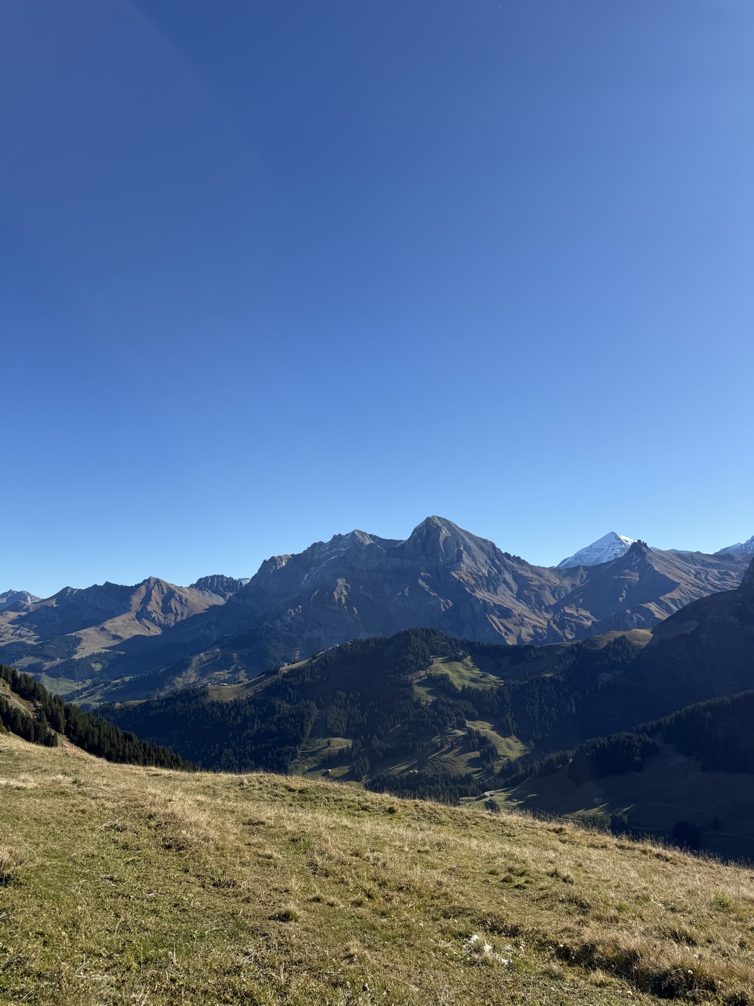 Weite Sicht auf die Berner Alpen – sanfte Hänge, tiefblaue Fernsicht und erste Schneespitzen auf den Gipfeln.
