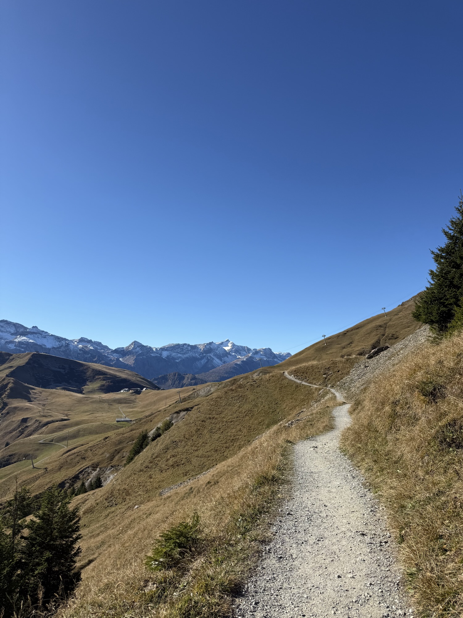 Schmaler Kiespfad durch goldene Wiesen – Panoramaweg oberhalb Adelboden mit Sicht auf die schneebedeckten Gipfel.