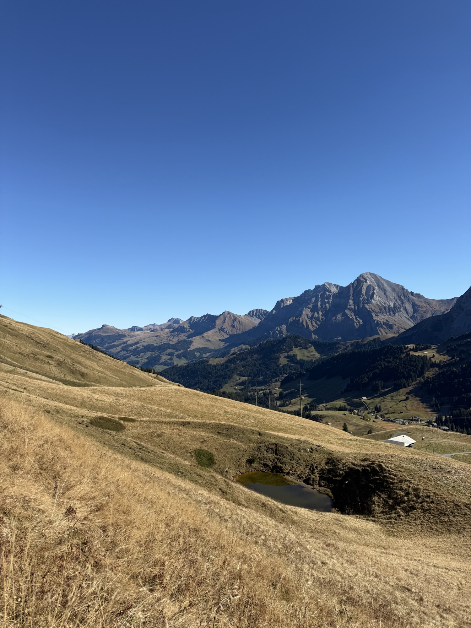 Aussicht über die Hänge des Hahnenmoospasses – goldene Gräser, kleiner Weiher und majestätische Bergkulisse im Hintergrund.