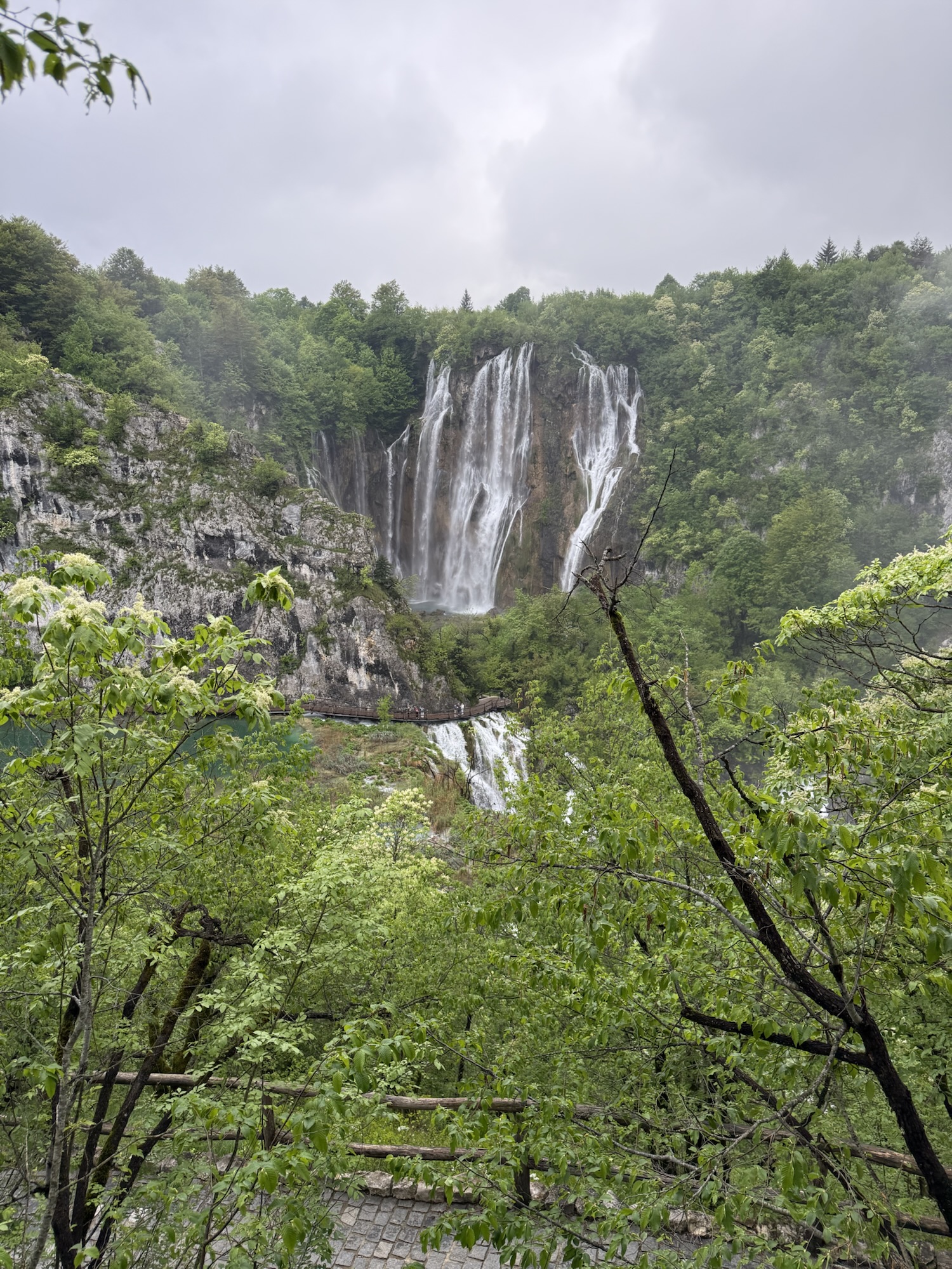 Majestätischer Wasserfall im Nationalpark Plitvicer Seen in Kroatien, umgeben von dichtem Grün und Felsen – ein beeindruckendes Naturhighlight bei leicht bewölktem Wetter.