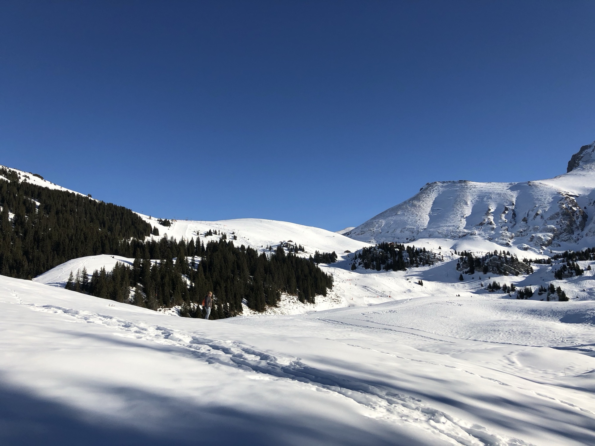 Präparierter Winterwanderweg auf der Elsigenalp mit Blick auf verschneite Berge im Berner Oberland