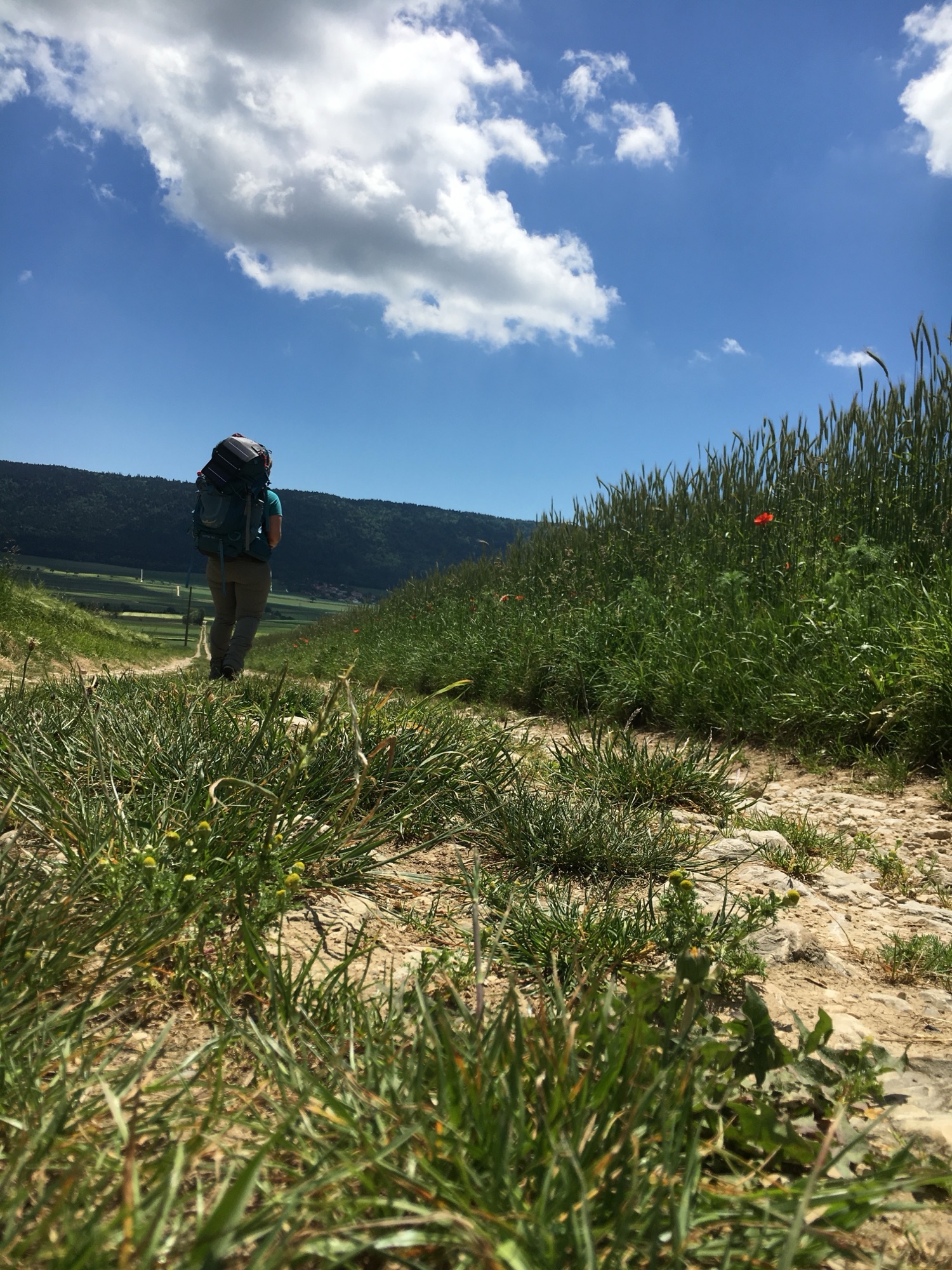 Wanderin mit Rucksack: Person mit großem Rucksack wandert einen steinigen Feldweg entlang, rechts und links hohe Getreidefelder, darüber blauer Himmel mit einer weißen Wolke.