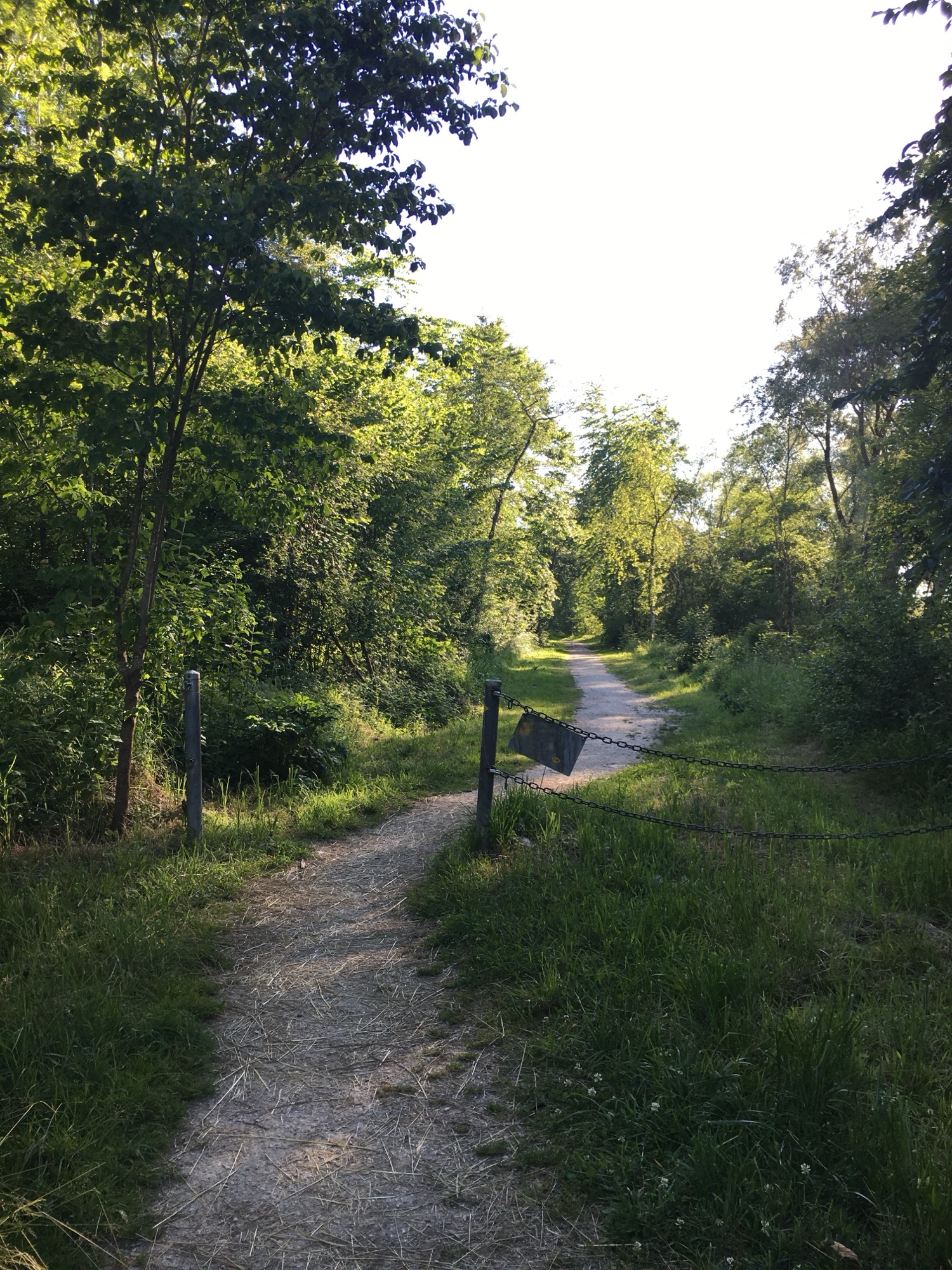 Waldweg: Schmaler Pfad mit Kette abgesperrt, führt durch einen lichten grünen Wald.