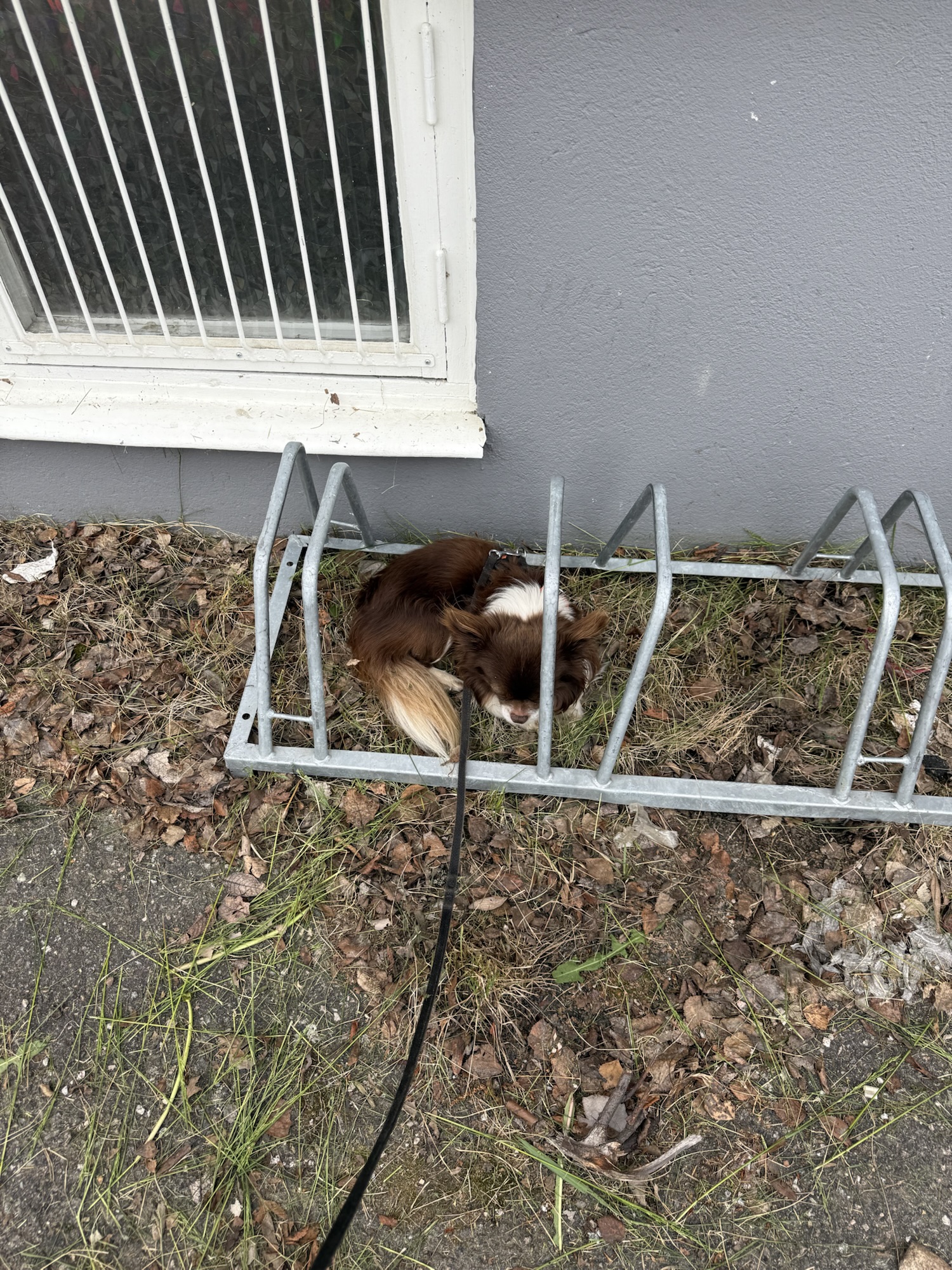 Nuo im Fahrradständer – Nuo hat sich zwischen den Metallstreben zusammengerollt, wirkt angespannt und sucht Schutz – ein Moment, der zeigt, dass er sich nicht wohl fühlt.