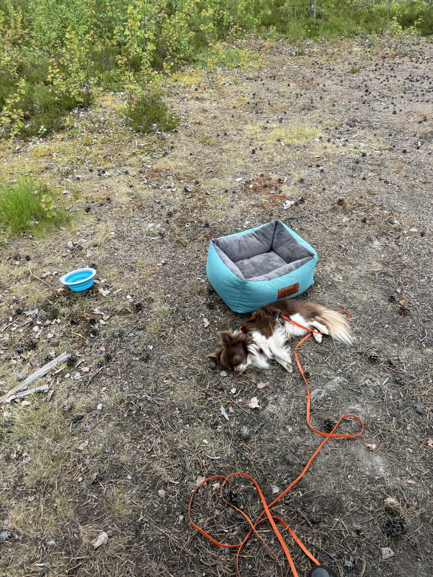 Hund schläft neben Hundebett im Wald – Ruhezeiten sind wichtig beim Vanlife mit Hund