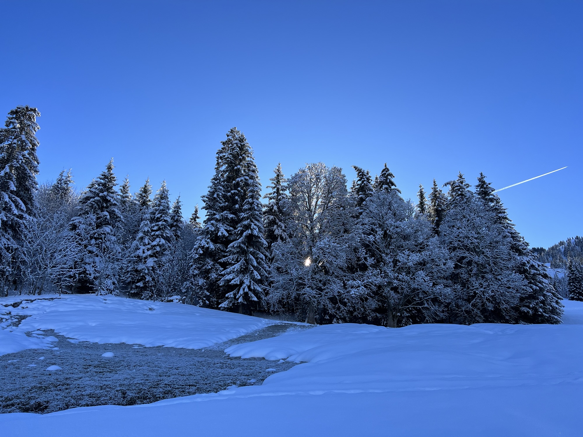 Winterlicher Waldweg mit frischem Schnee entlang der Route Richtung Saanenmöser
