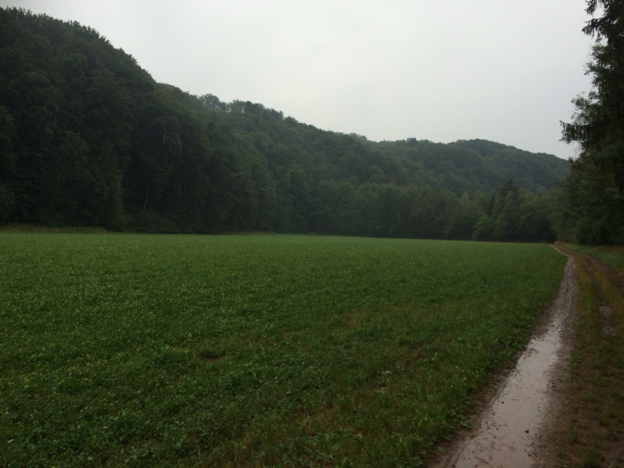 Nasse Wiese vor bewaldeten Hügeln, ein schlammiger Feldweg führt am Waldrand entlang.