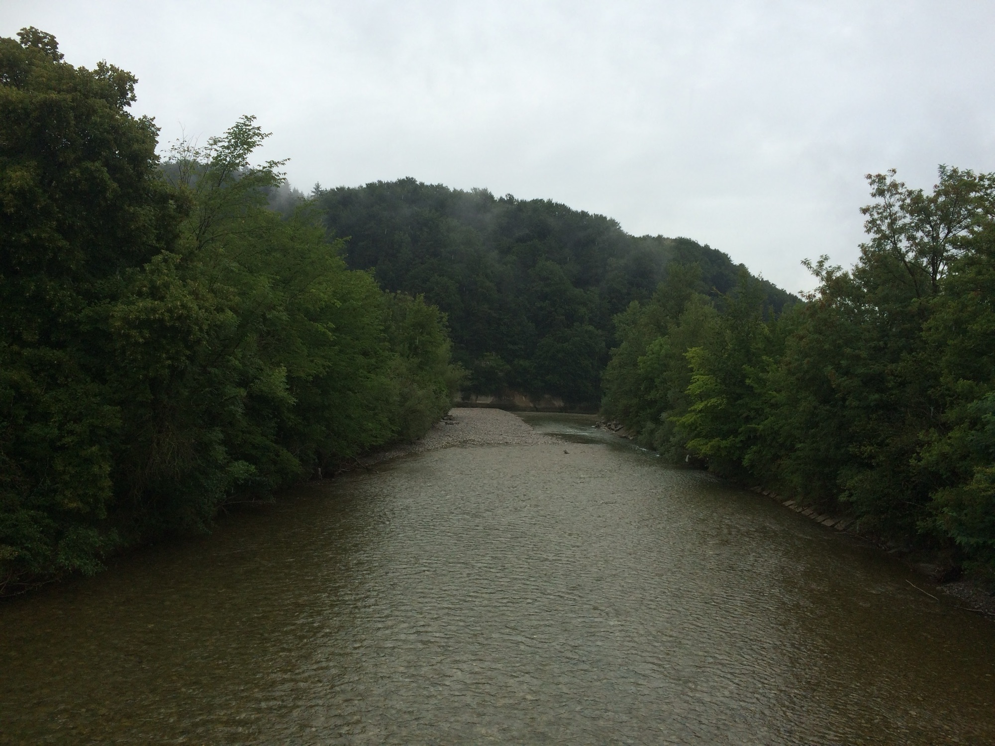 Blick von der Brücke auf den Zusammenfluss von Sense und Saane, umgeben von grünen Bäumen