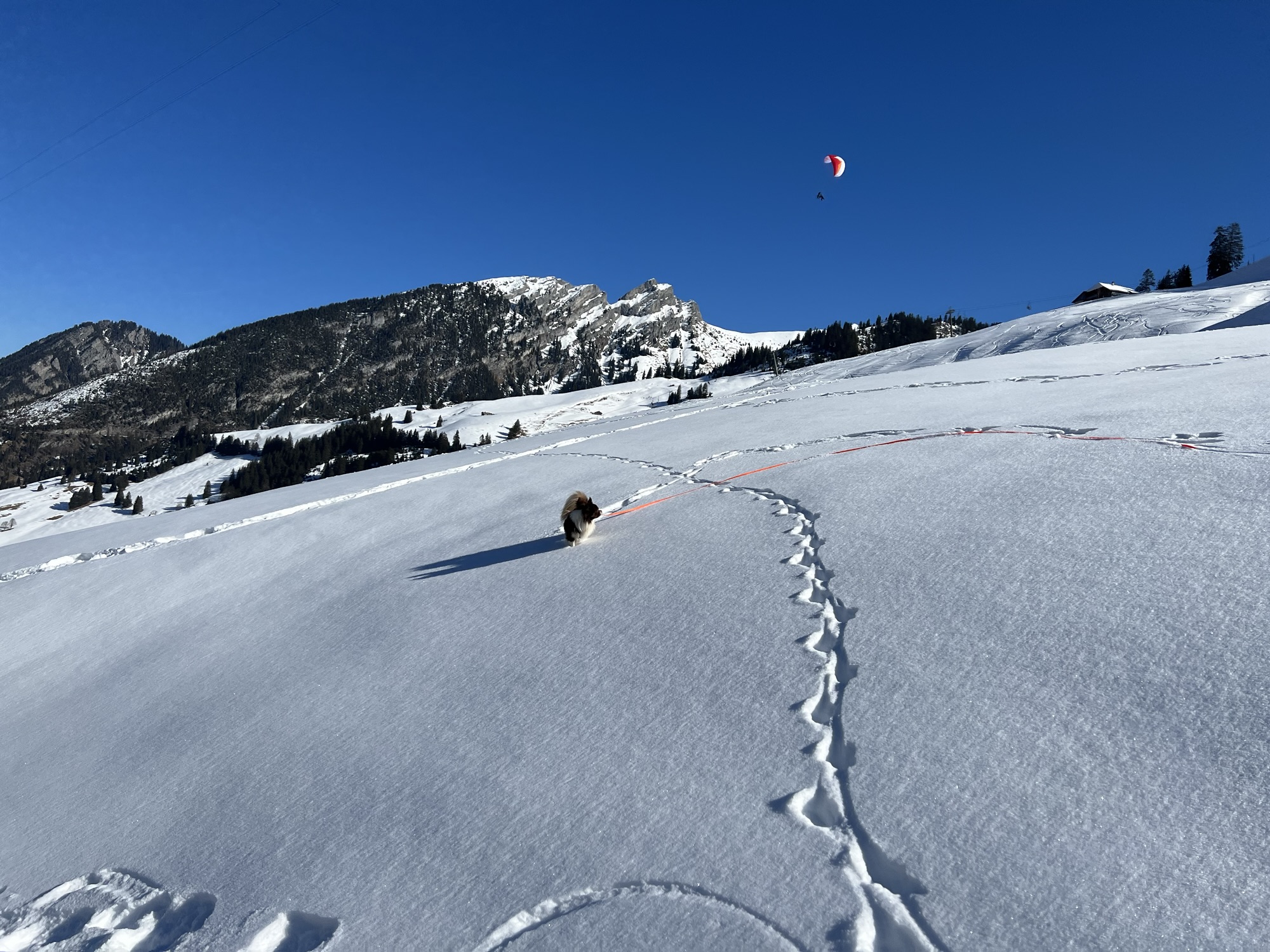 Hund auf Winterwanderung im Diemtigtal auf verschneiter Alpfläche mit Blick auf die Berge und Gleitschirm am Himmel