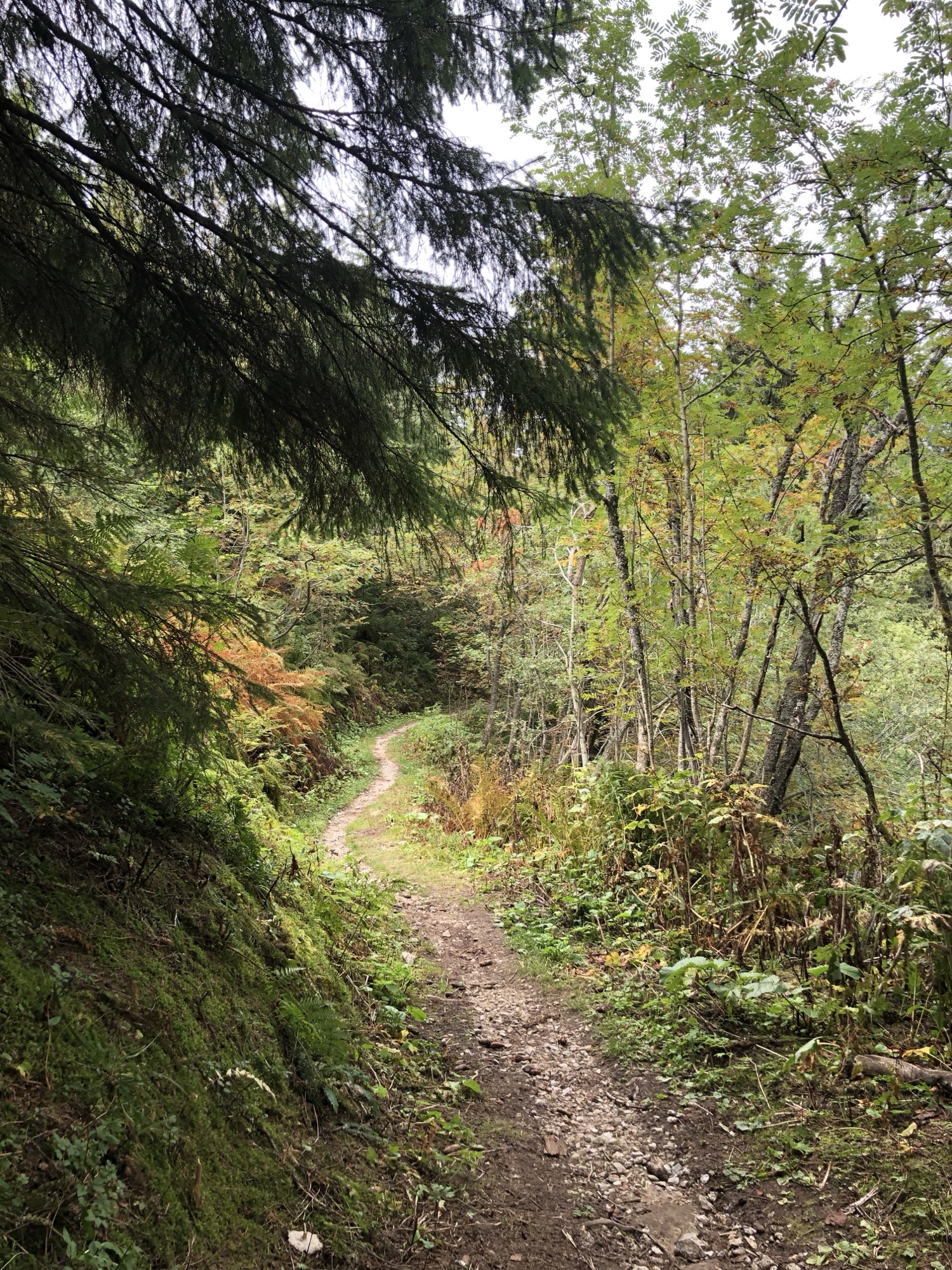 Schmaler Wanderweg durch herbstlichen Wald auf der Rundwanderung Selibühl im Gurnigelgebiet; moosige Böschung, buntes Laub und ruhige Naturstimmung.