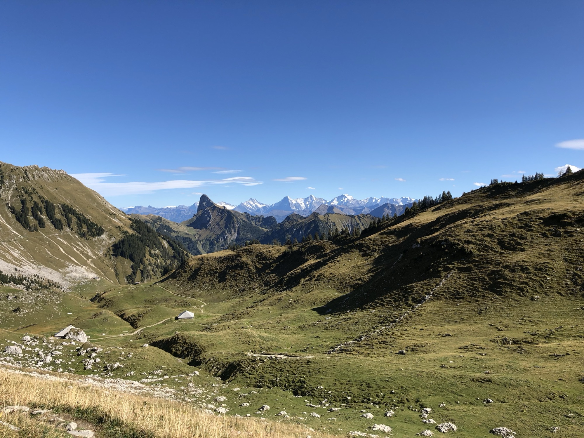 Weite Aussicht über die Gantrischregion mit Alpwiesen und Bergkuppen – Blick bis zu den Berner Alpen.