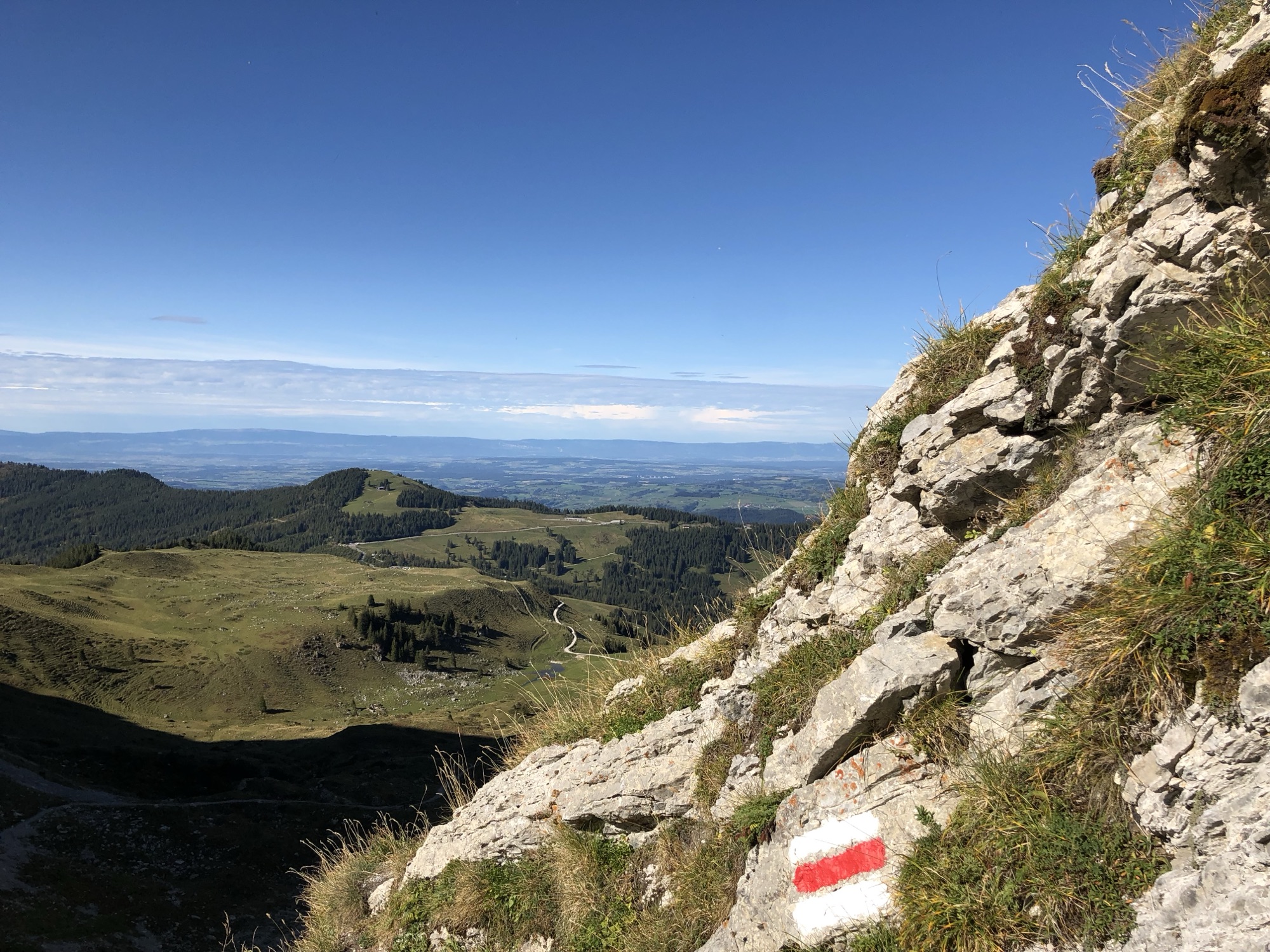 Aussicht vom Morgetepass über die Voralpen bis zum Mittelland – Wanderwegmarkierung rot-weiss auf Felsen.