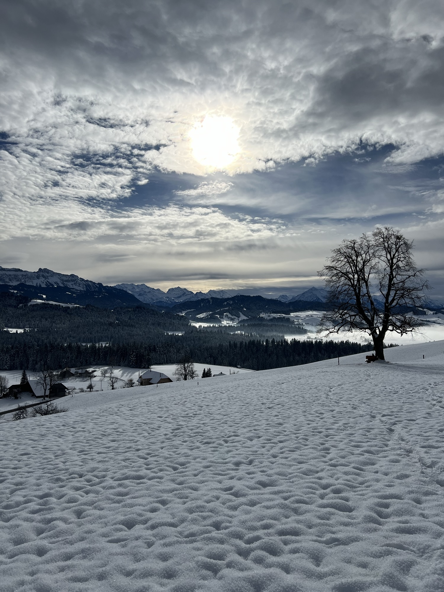 Winterliche Hügellandschaft mit Blick auf die Berner Alpen beim Wandern in Bern – ruhiger Berner Wanderweg im Schnee