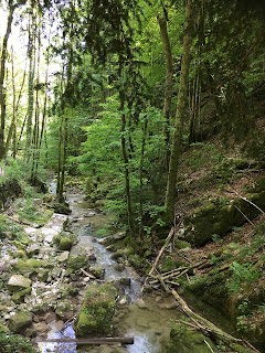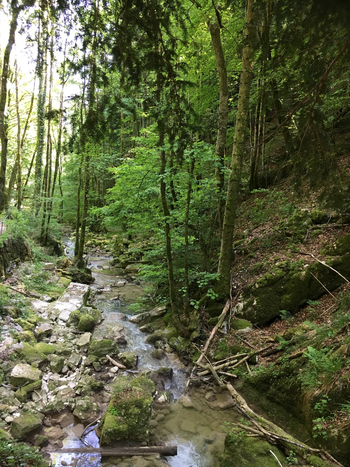 Wir erreichen denn Twannberg und bald darauf auch die Twannbachschlucht. Endlich die Möglichkeit für Shila sich richtig abzükühlen. Wir laufen durch die Schlucht Richtung Twann. Es ist von den Temperaturen nun sehr angenehm kühl und erfrischend. Es bietet sich zudem eine sagenhaftes Naturschauspiel um uns herum. Ein bisschen weniger eindrücklich allerdings als die Rosalauischlucht bei Meiringen. Das saftige Grün im Wald zeigt an, dass wir nun doch im Sommer angekommen sind.