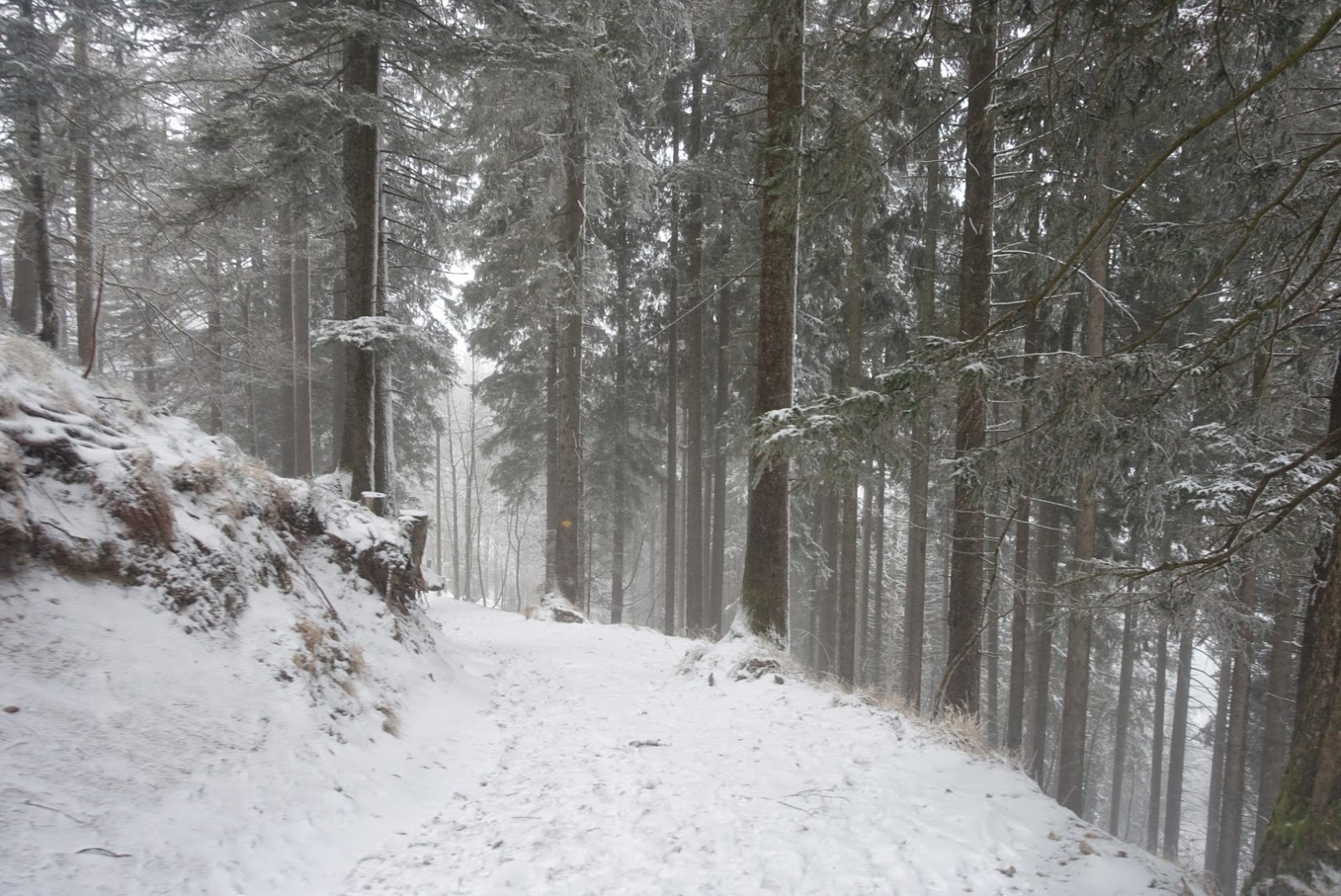 Wir starten auf der Mettlenalp, wo der Weg ziemlich steil hoch zum Napf geht. Unterwegs schneite es ununterbrochen und der Ausblick bleibt uns somit leider auch verwehrt. Der Weg führt uns hauptsächlich durch den verschneiten Wald.