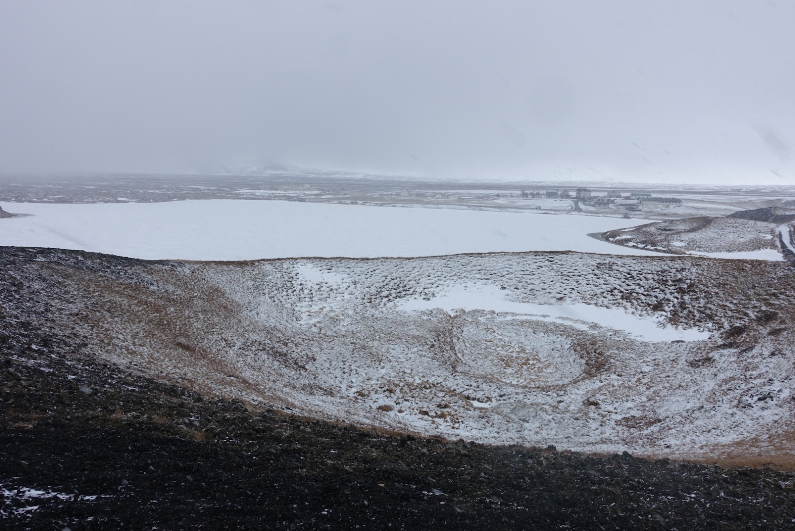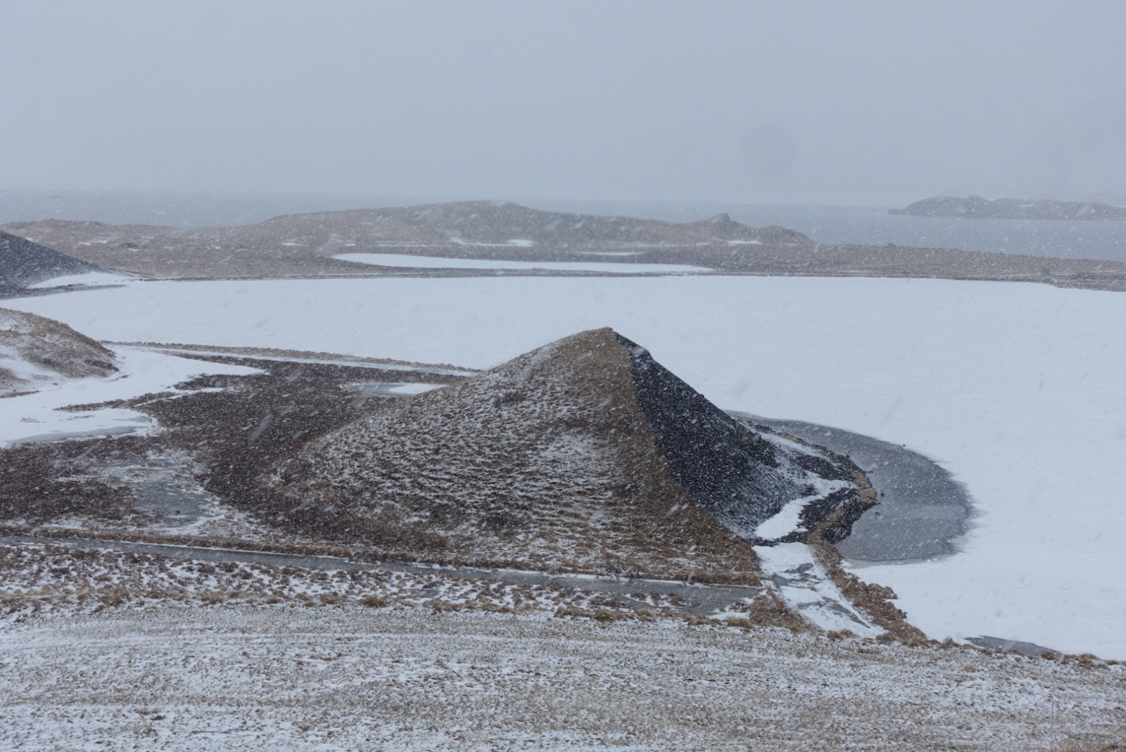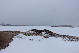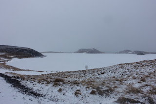 Früh am Morgen sind wir wieder wach. Da wir unsere Lebensmittel im Kühlschrank bei Oli deponiert haben, müssen wir Ihn leider wecken. Er scheint es aber gelassen zu nehmen. Seine Kollegin ist erstaunt, dass die Schweizer Girls so früh munter sind. Oli spricht auch gleich einige Wörter Französisch als wir ihm sagen, dass wir Schweizer sind. In unserem Reiseführer sehen wir, dass es in der Gegend einiges zu sehen gibt. Olis Bekannte gibt uns zudem noch einige Tipps. Wir planen um den See zu laufen. Das Wetter ist leider nicht wirklich schön, so dass wir schlussendlich um den See fahren. Myvatn bedeutet übersetzt «Mückensee». Im Sommer soll es grosse Mückenschwärme am See geben. Der See weisst eine Fläche von 37km2 auf. Wir machen den ersten Halt bei den Pseudokrater von Skutustadir. Diese haben nicht selbst vulkanisches Material ausgestossen, sondern sind durch das explosive Zusammentreffen von Lava und Wasser entstanden. Wir machen einen Rundgang durch die Landschaft. Leider sieht man durch das schlechte Wetter nicht sehr weit. Trotzdem machen wir einige Fotos bevor es zu unserem nächsten Halt geht.
