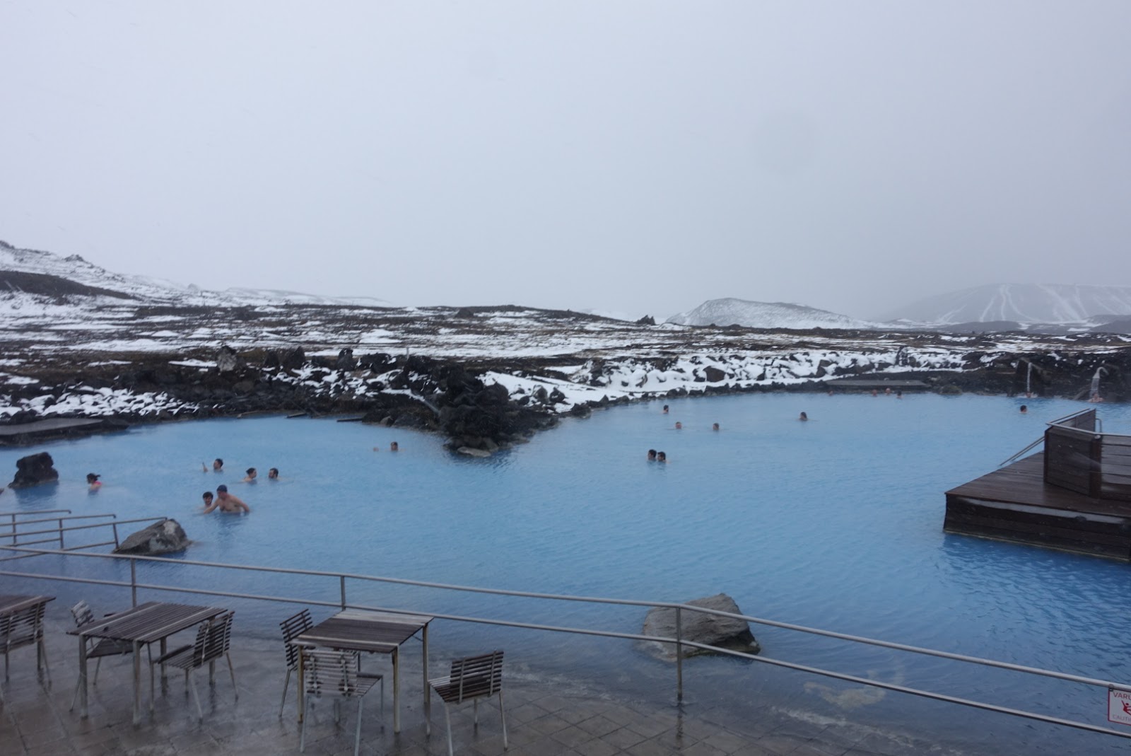 Nach der Besteigung des Hverfjall haben wir uns ein entspanntes Bad im Naturbad verdient. Schnell finden wir das Bad. Wir kommen auf die Idee bei doch eisigen Temperaturen im Bikini noch Fotos vom Bad zu machen. Das Bad sieht auch bezaubernd aus mit dem milchigen Blau. Wir geniessen das Warme Bad und wärmen uns auf. Mutig wie wir sind, nehmen wir auch noch eine Runde im kälteren Teil des Bades in Kauf. Schliesslich will auch dieser Teil getestet werden. Die Haut fühlt sich im Bad wirklich wie beschrieben sehr weich und zart an.